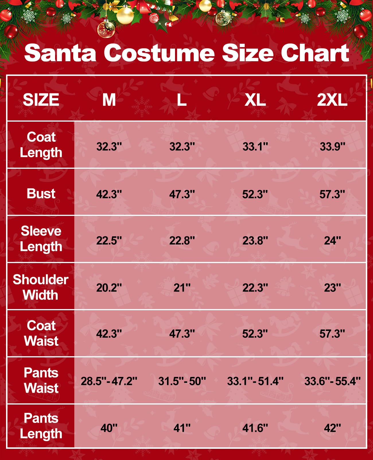 Size for All Men --- The green funny santa suit Medium size suitable for men under 130Ib; Large size suitable for men about 150lb; X-Large size for men about 150-220lb ; XX-Large size for men about 210-310lb. Please refer to size chart before ordering the green santa claus costume for men. With this green furry santa suit adults men, you will attract everyone's eyes in any occasion.