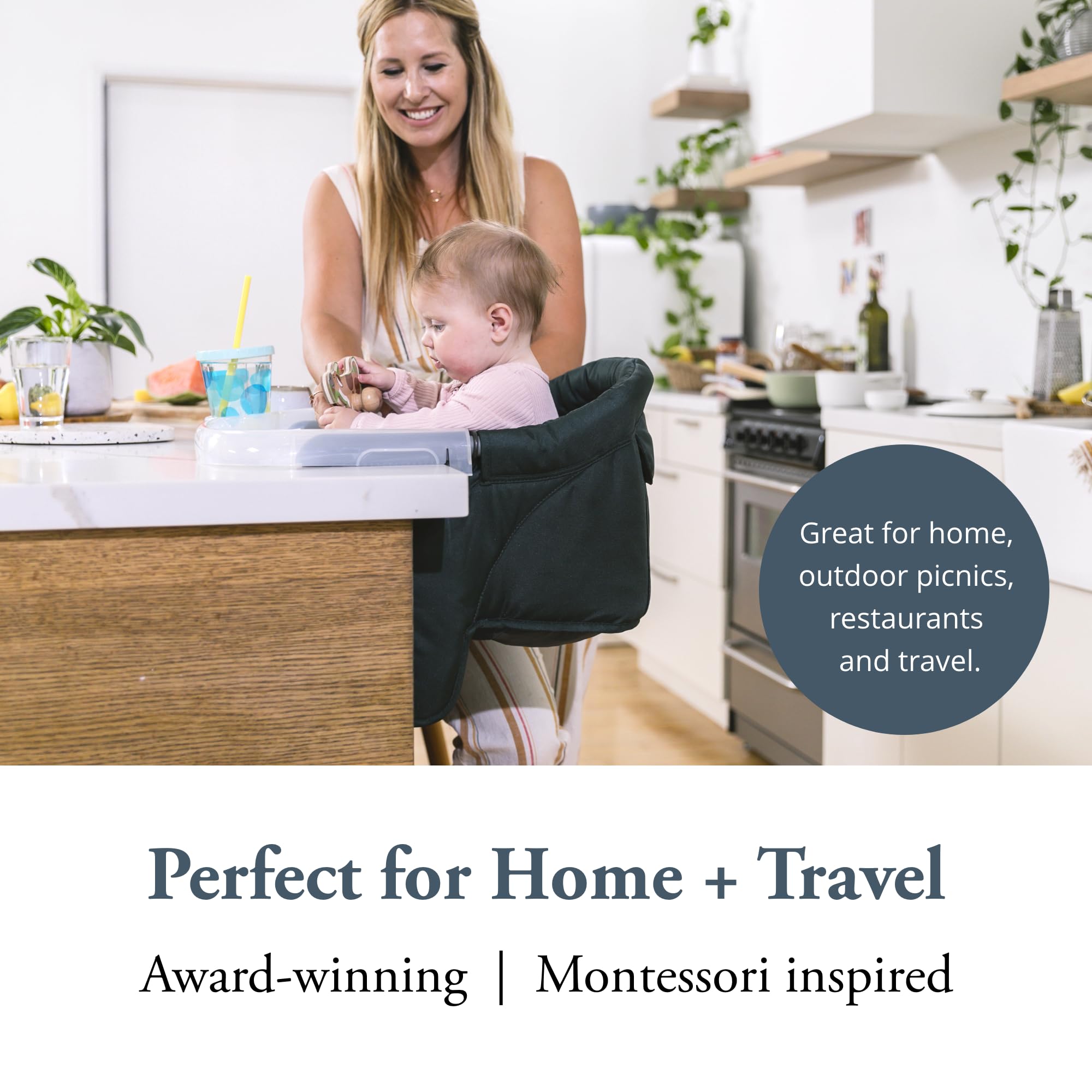 CONVENIENT STORAGE & ACCESSORIES: Features a rear storage pocket for baby items, a washable cover, and a built-in carry bag for easy transport. Add the optional food catcher tray with a cup holder for a tidy feeding experience, available separately