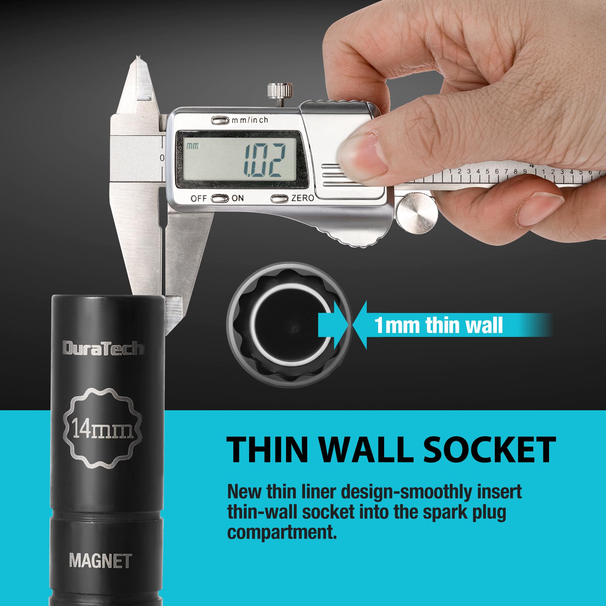12-POINTS SOCKET WITH THIN-WALL DESIGN: The socket features a 12-point thin-wall design that provides excellent torque transfer and grip. This design not only enhances stability in tight spaces but also reduces the risk of rounding off corners. 12-points socket can be inserted into a hexagonal nut faster than 6-points socket. It's an essential tool for spark plug removal, especially in confined spaces that require high precision