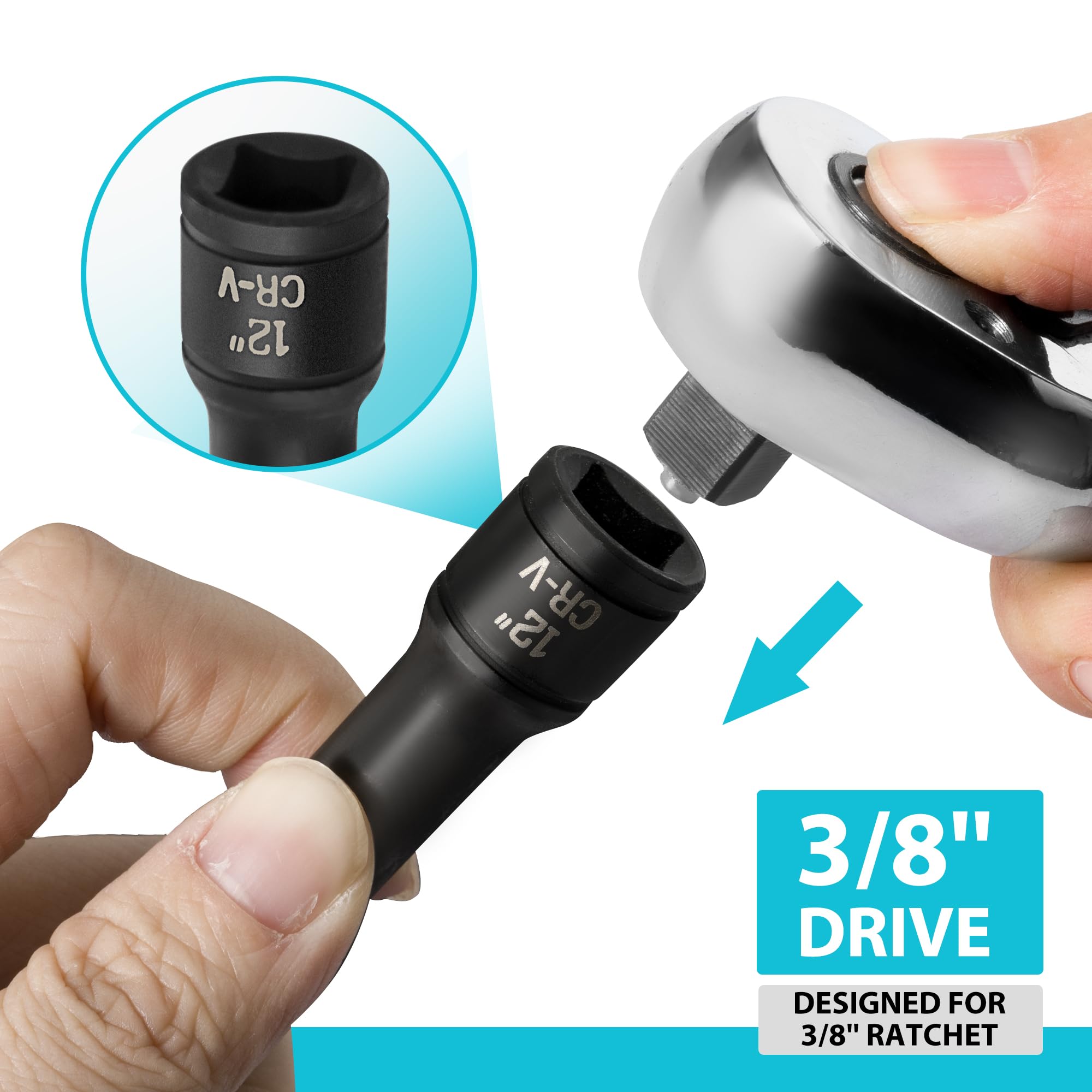 HIGH-QUALITY CR-V STEEL MADE: The socket is made from heat-treated CR-V steel with a manganese phosphate black finish surface, providing outstanding durability and resistance to wear and corrosion. The manganese phosphate black coating not only prevents rust and corrosion but also makes the tool easy to clean, ensuring optimal performance in various work environments, making it suitable for long-term use. The socket also has laser-etched size markings for quick and easy identification