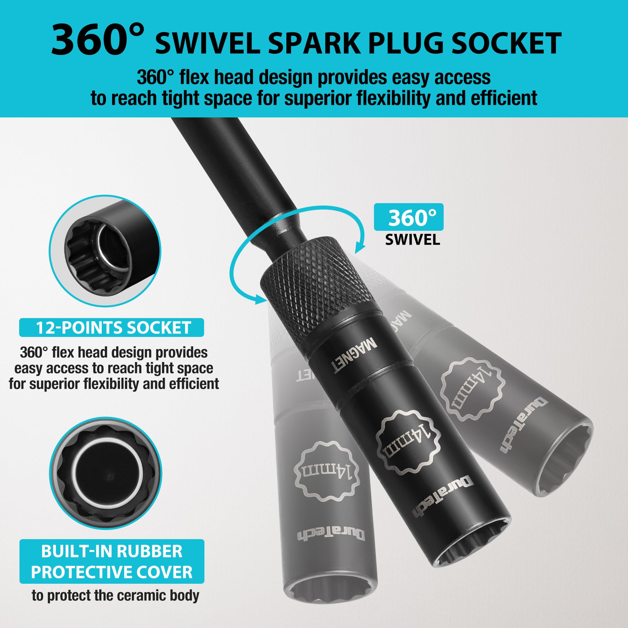 360° SWIVEL SPARK PLUG SOCKET: Spark plug socket features a 360° rotating joint, which enhances the spark plug socket’s flexibility, allowing you to easily access hard-to-reach areas for superior flexibility and efficient, especially in tight engine bays. This design significantly improves work efficiency, making spark plug removal and installation much easier and more convenient, particularly in confined spaces. Built-in rubber protective cover to protect the ceramic body