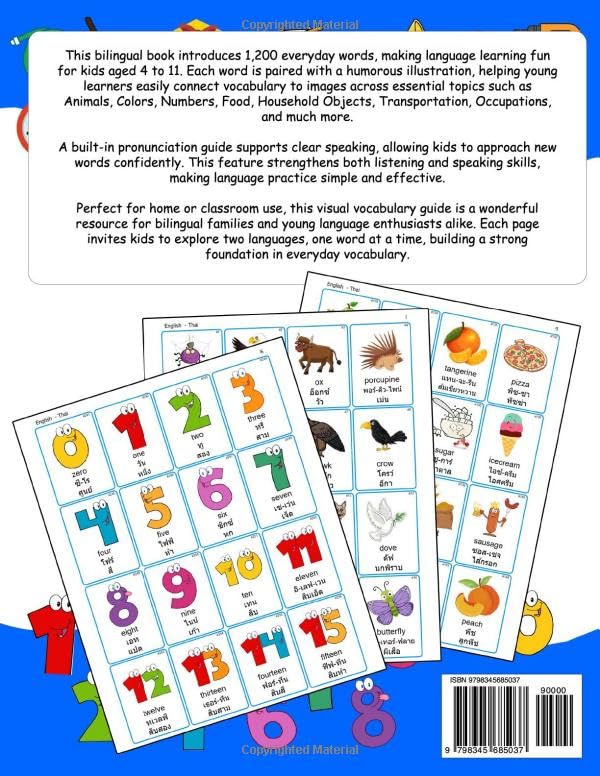 'Learn English Thai 1200 Everyday Words with Pronunciation Guide (Colorful Edition): A Visual Bilingual Vocabulary for Kids' is an engaging and educational bilingual book designed to make language learning fun and accessible for children ages 4-11. Featuring 1,200 everyday words across essential categories—including Numbers, Animals, Fruits & Vegetables, Colors, Household Objects, Transportation, Occupations, Emotions & Actions, and Food & Drink—this book introduces young learners to both English and Thai in a playful, interactive way. Each word is accompanied by a vibrant Colorful illustration, the English word, a pronunciation guide written in Thai script for easy learning, and the Thai equivalent, making it ideal for visual and auditory learners alike. This comprehensive approach ensures kids can build their vocabulary and pronunciation skills naturally, whether they’re just starting out or reinforcing what they know. Perfect for at-home learning, classroom use, or as a resource for bilingual families, this book is more than just a vocabulary list—it’s a journey into language and culture that sparks curiosity and confidence in young minds. Product Details: * 1200 basic words with pictures. * 75 pages printed in full color. * Special Bonus: Bilingual Word Search Puzzles. * Printed on bright white smooth paper. * Premium matte cover finish. * Perfect for all lettering mediums. * Large format 8.5" x 11.0" (215mm x 280mm) pages.