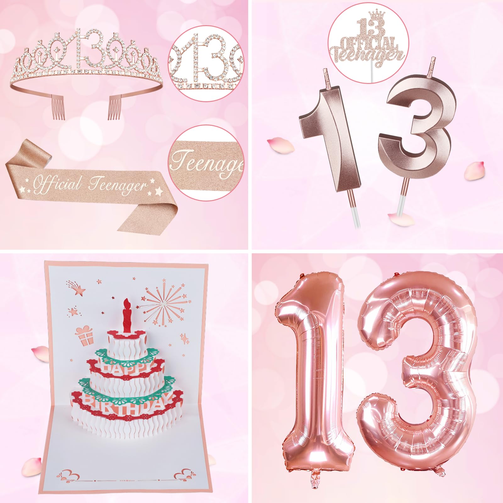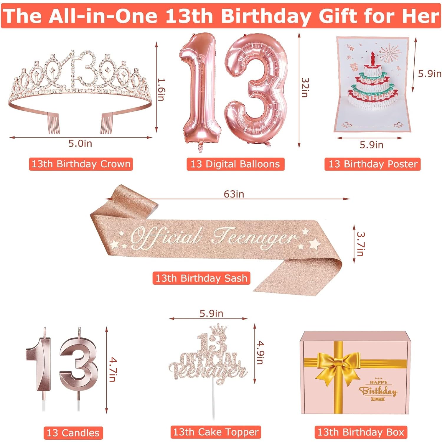 13th Birthday Decorations:Coming with 13th Birthday Tiara x 1pc, Official Teenager Birthday Sash x 1pc, 13th Birthday Cake Topper x 1pc, Number 13 Candles x 1set, Big Number 13 Balloons x 1 set, 3D Birthday Card x 1pc. This great valuable rose gold 13th birthday gift for girls has been packed in a beautiful gift box for thoughtful presentation. Don't forget to leave her a message! Select "THIS ORDER CONTAINS A GIFT" at checkout and add a personalized gift message with your name