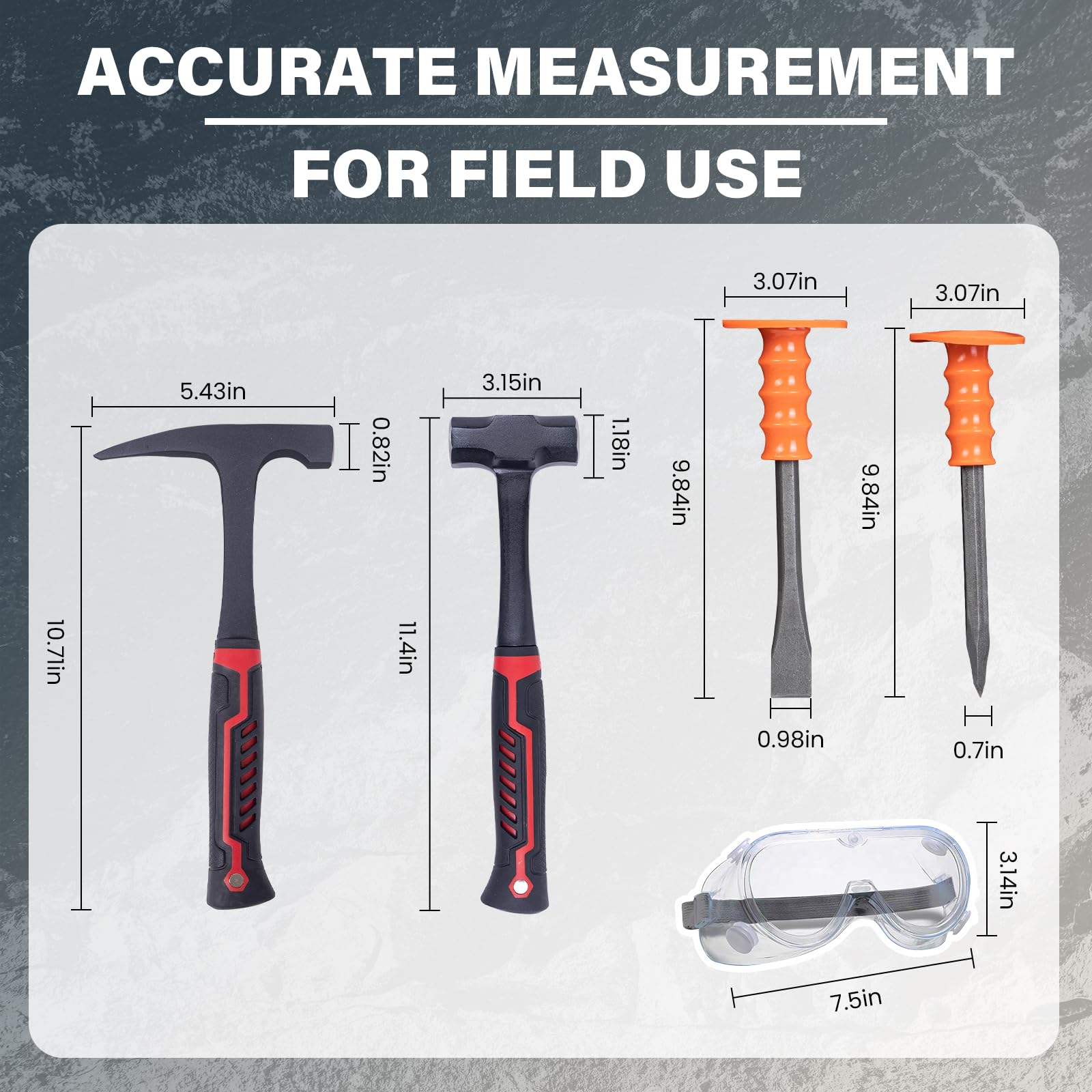Complete Geology Tool Kit – Includes a geological rock pick hammer, octagonal hammer, 2 chisels, safety goggles, magnifying glass, compass, whistle, and two pairs of protective gloves. Everything you need for rock collecting and outdoor exploration.