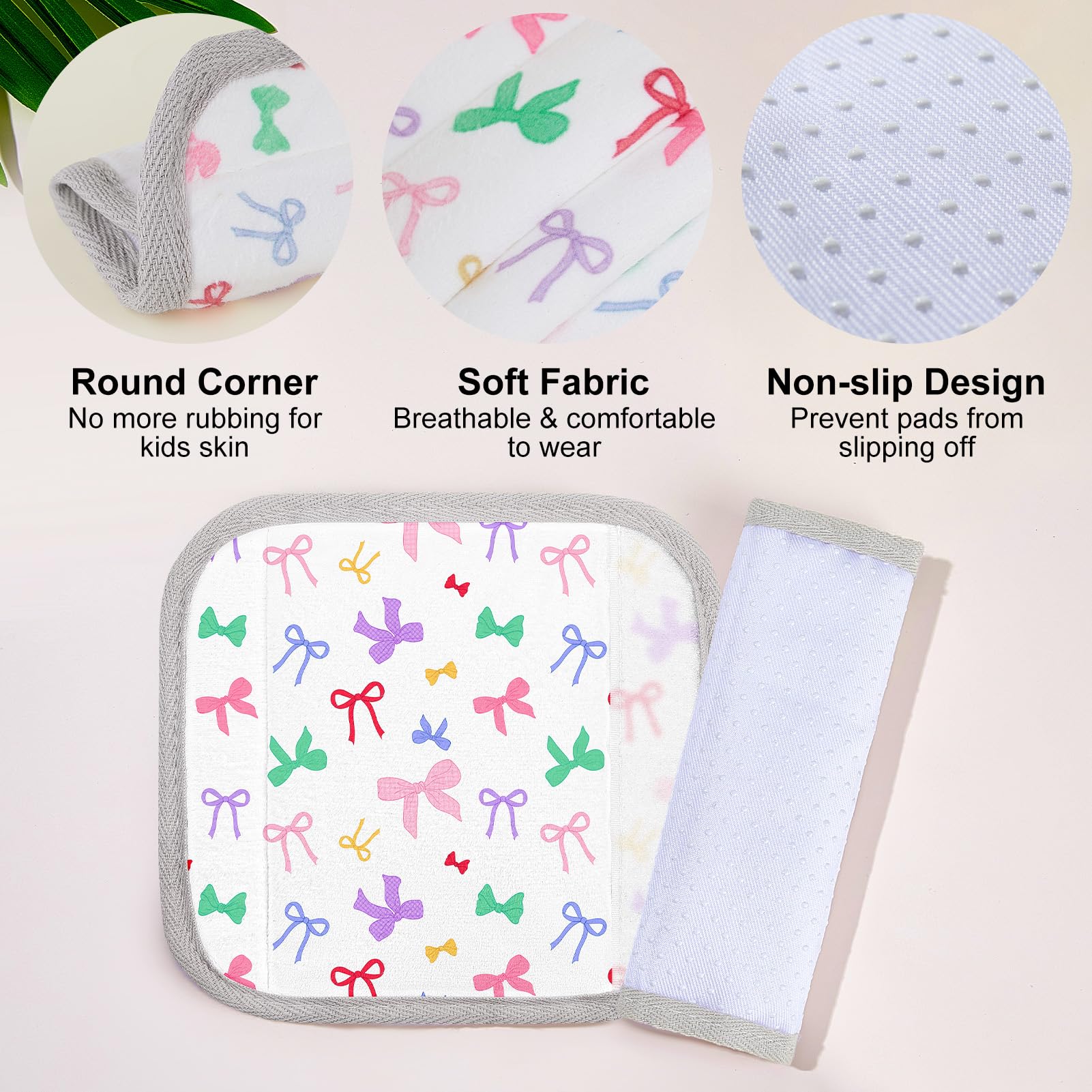 Universal Size & Anti-Slip: Our seatbelt covers for kids come in two sizes—small (5.9 × 2.6 inches) and large (9.4 × 6.3 inches)—specially designed for babies and kids, fit most car seats, strollers and pushchairs; The inside of the seat belt covers is an anti-slip design, keeping it in place with no sliding