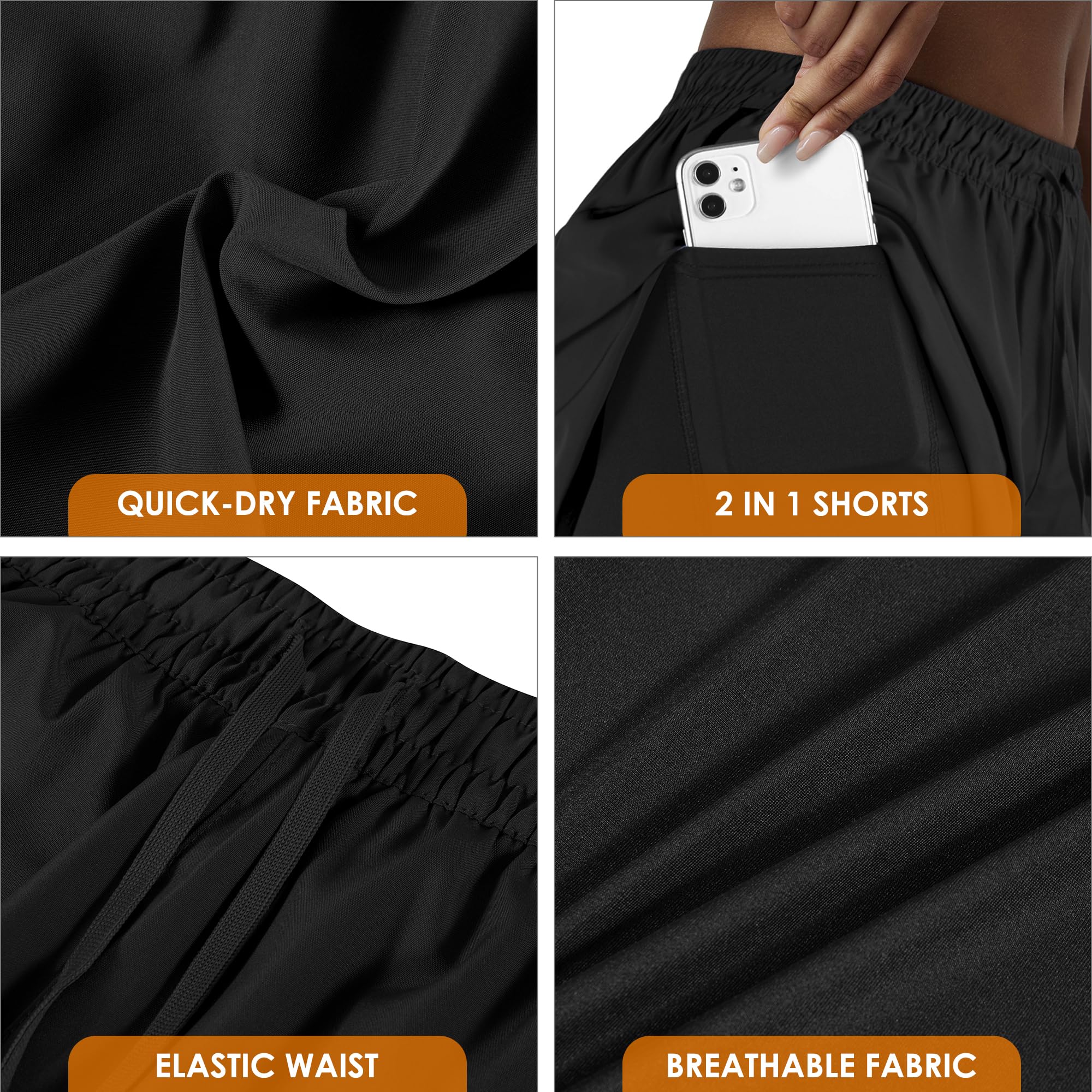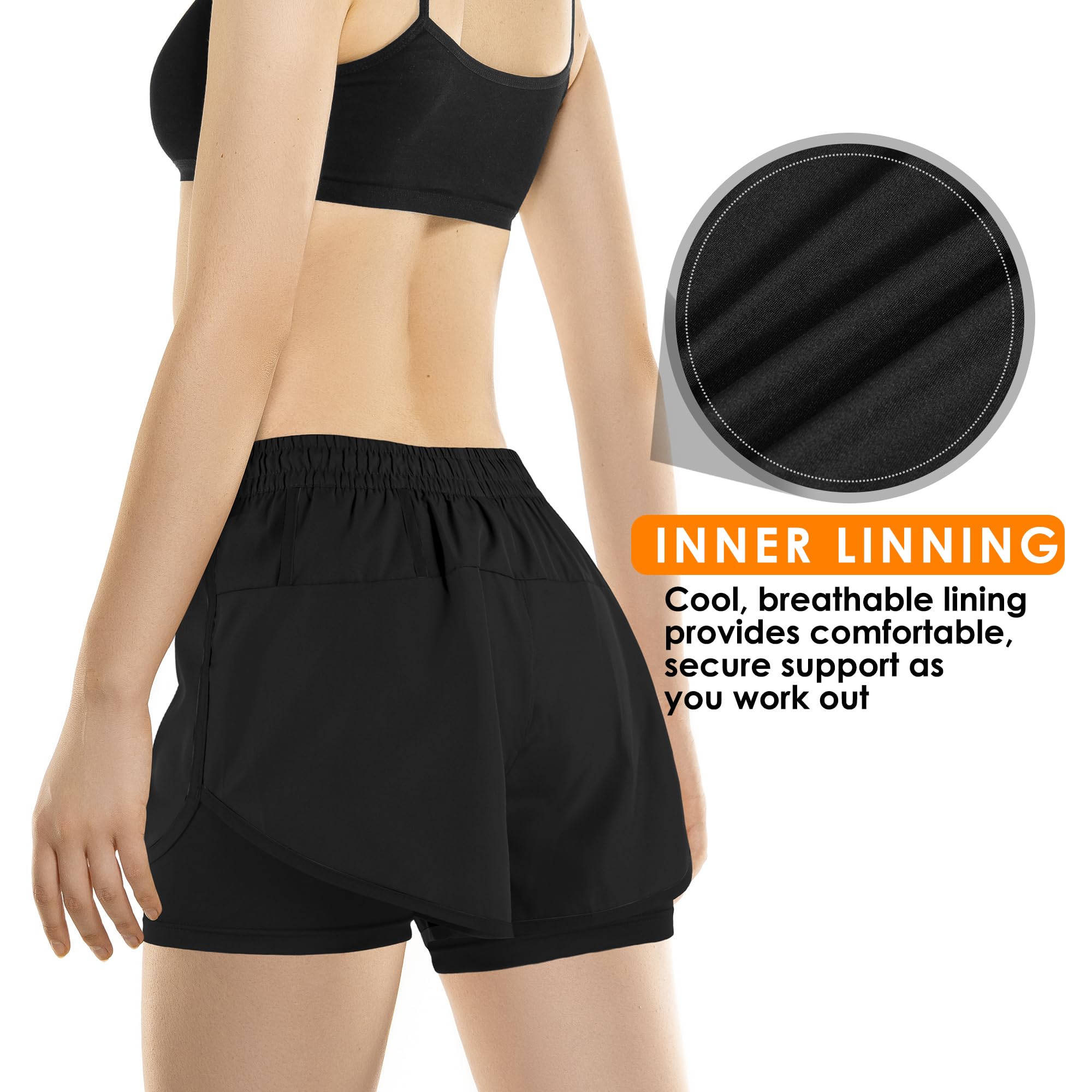 2-IN-1 DESIGN: Women's running shorts are double-layered Design with inner layer provide elastic support and protective coverage can greater freedom of movement.; Outer layer has side slit design provide greater range of movement and breathable function.