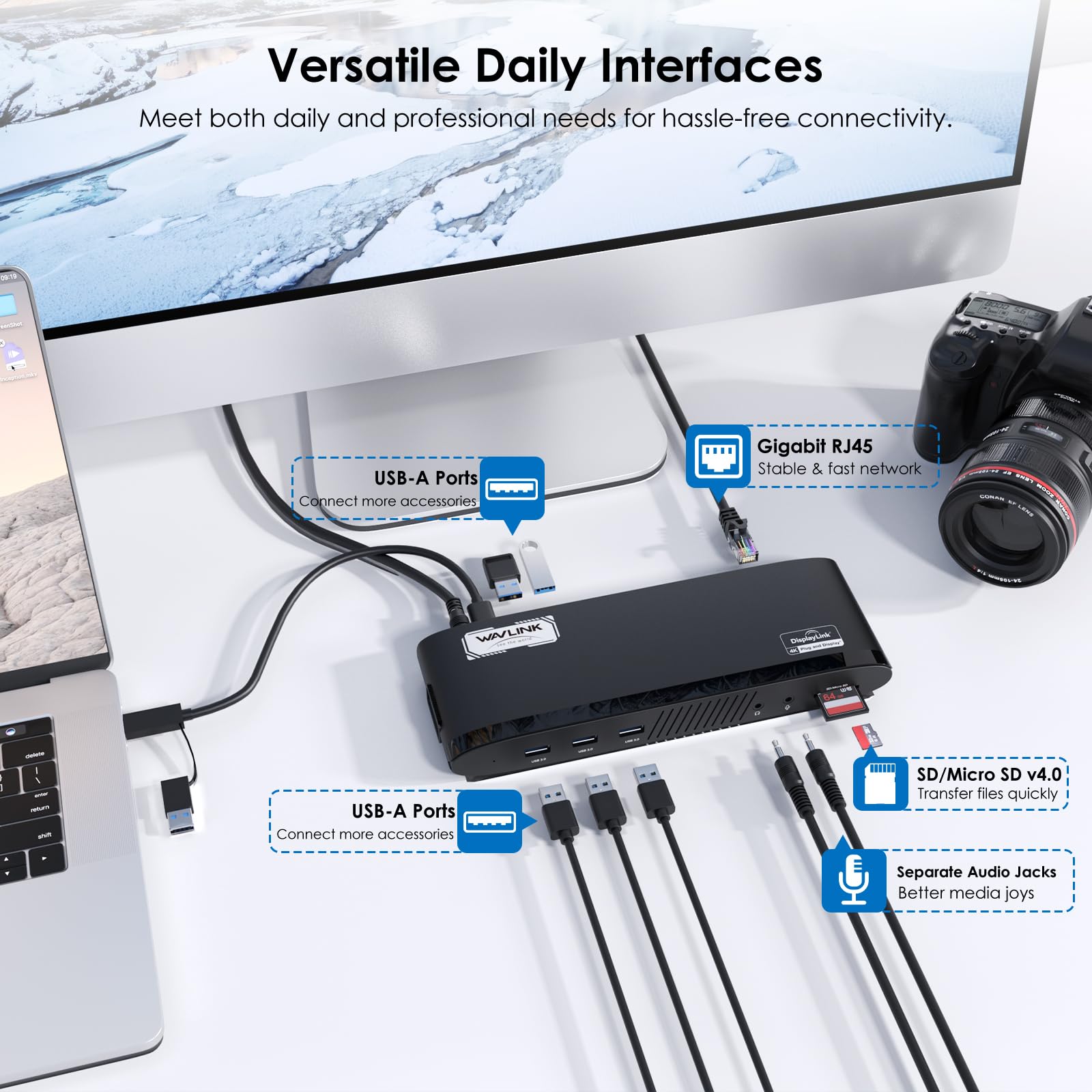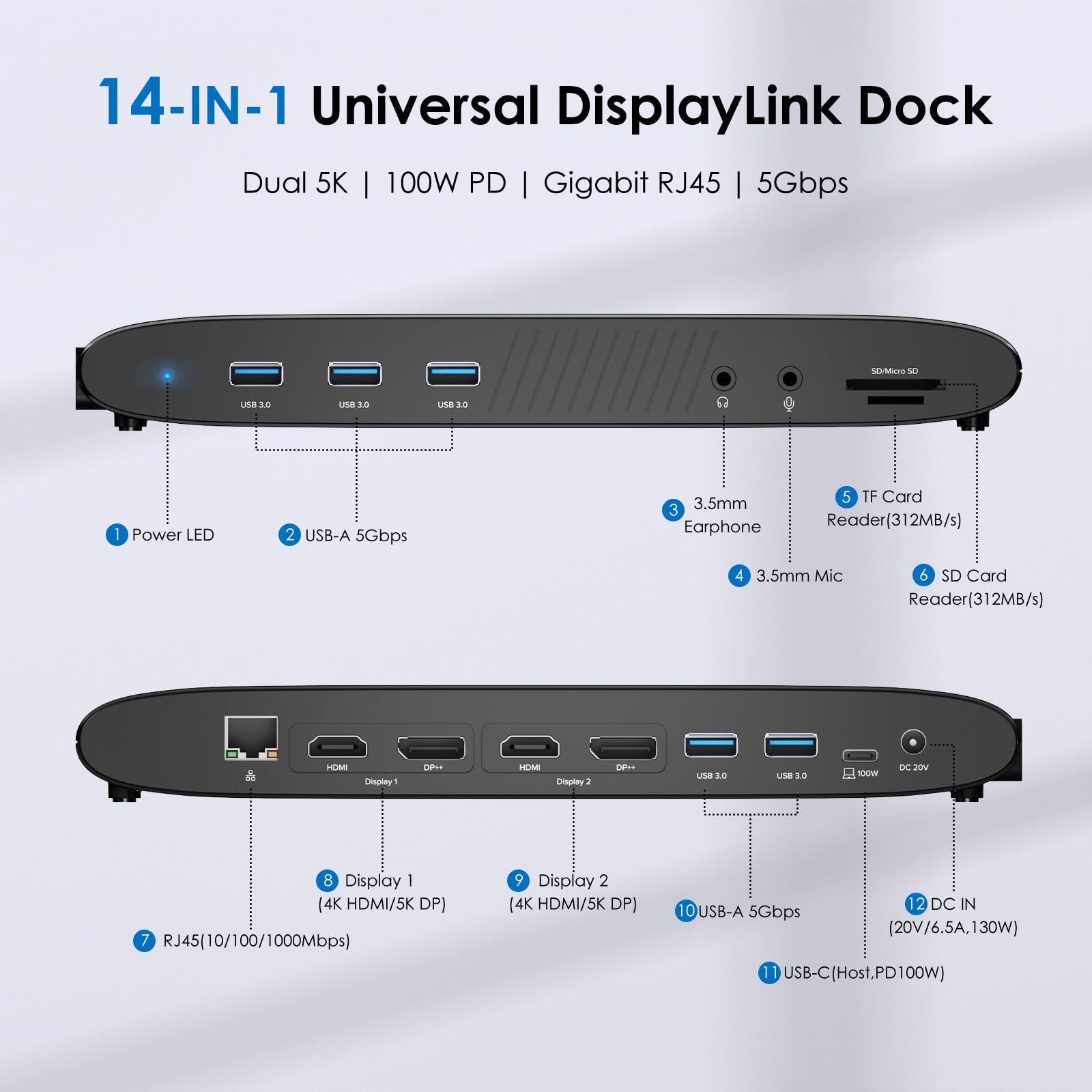 14-in-1 Versatile Ports: Use WAVLINK docking station expand your laptop's connectivity with 2 DisplayPort, 2 HDMI, 5 USB-A 5Gbps ports, RJ45 Ethernet, separate 3.5mm earphone and 3.5mm mic jacks, and SD/TF card readers.