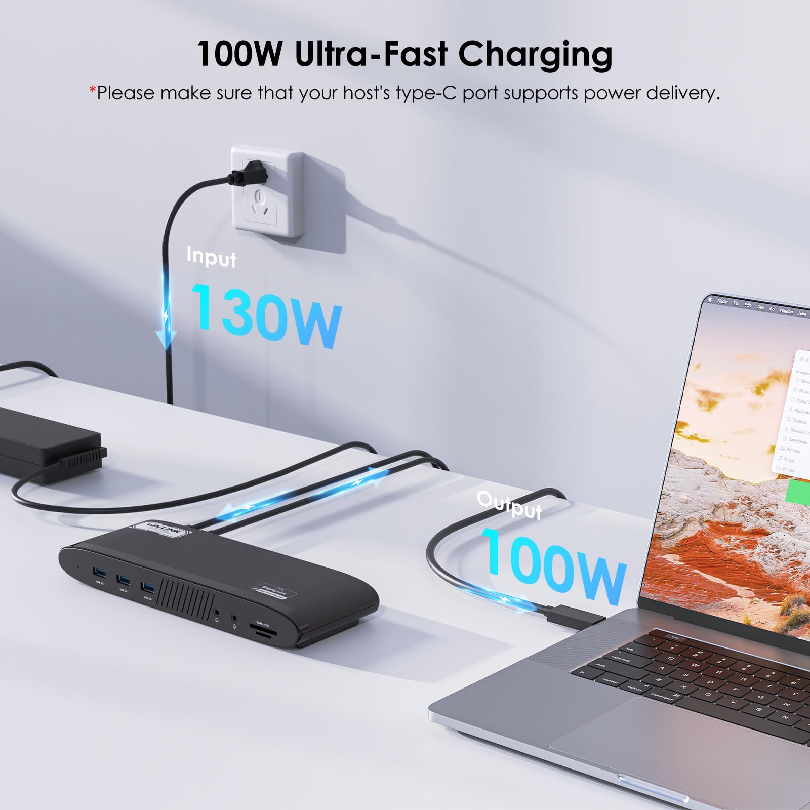 Reliable 100W Power Delivery: The host USB-C port, powered by a 130W adapter, provides up to 100W out for your laptop, keeping it running all day. *Please verify that your laptop’s Type-C port supports power delivery.