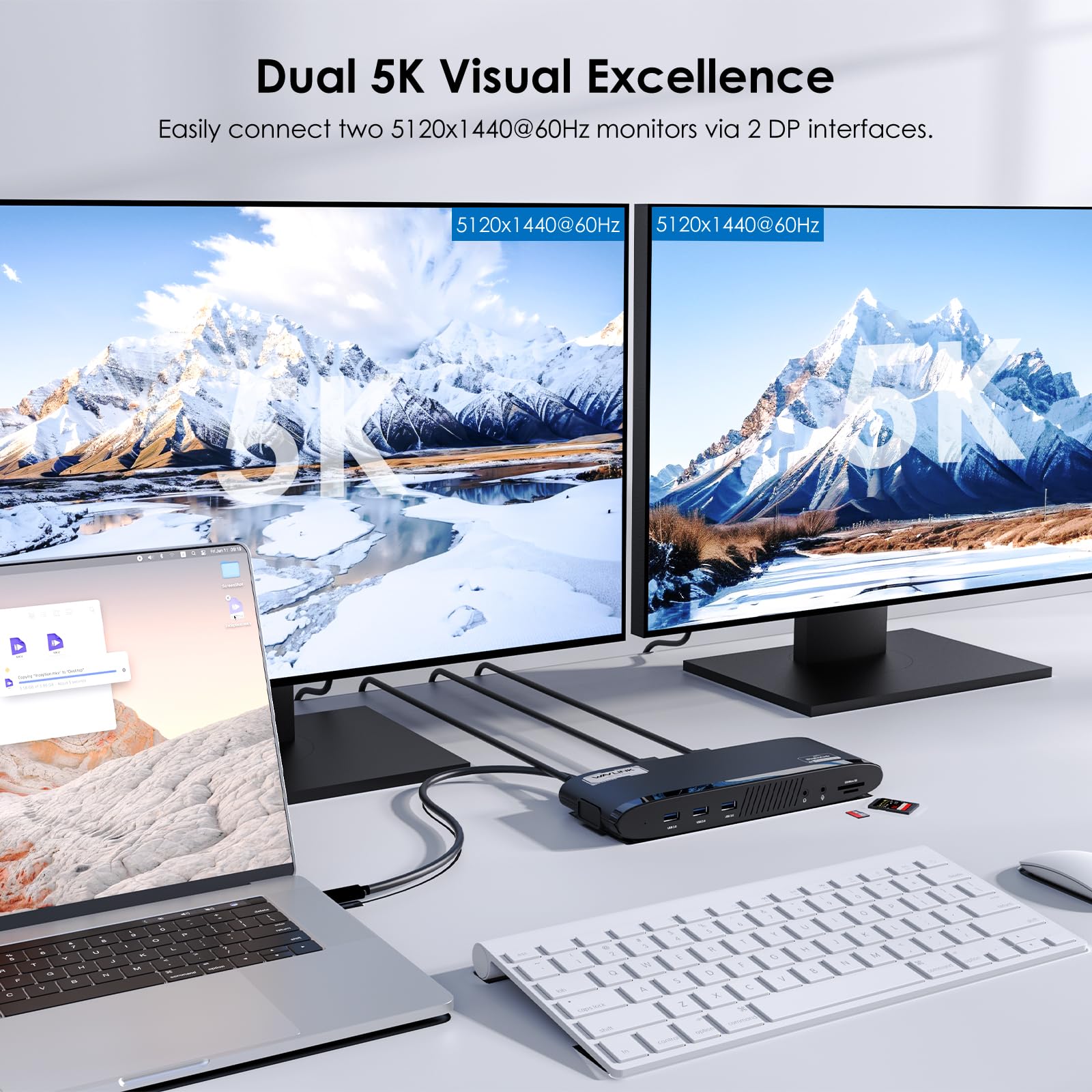 Dual 5K Display: Easily connect two 5120×1440@60Hz or 4096×2160@60Hz monitors via 2 DP + 2 HDMI interfaces, ideal for multitasking, document editing, and web browsing. Dual display docking station supports various 4K/5K combinations, delivering sharp visuals. Note: Use only one video port (DP or HDMI) per "Display"; not suitable for gaming or intensive tasks.