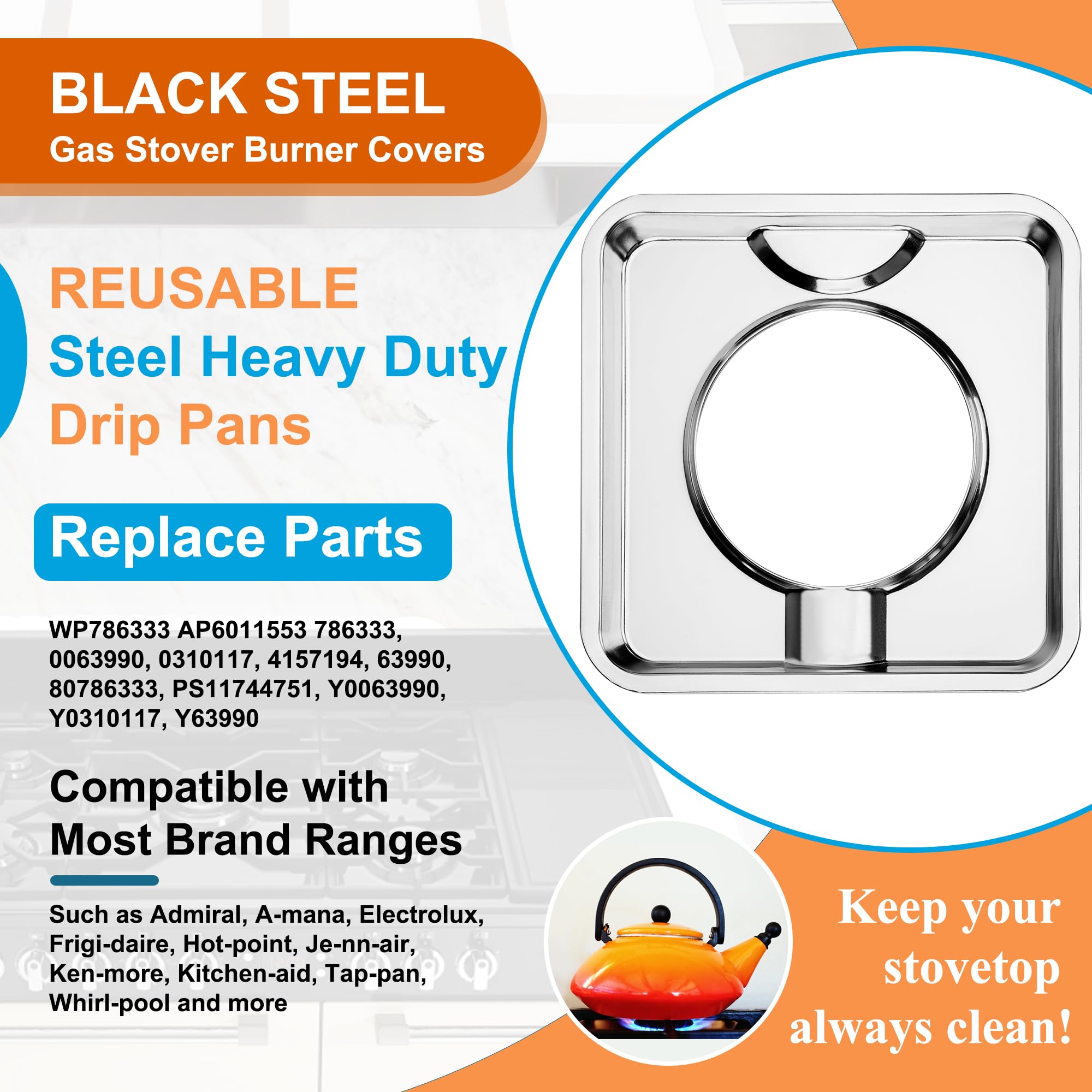 𝗚𝗮𝘀 𝗦𝘁𝗼𝘃𝗲 𝗣𝗮𝗻𝘀 𝗥𝗲𝗽𝗹𝗮𝗰𝗲𝗺𝗲𝗻𝘁 𝗣𝗮𝗿𝘁𝘀: 7.75" chrome square gas burner liner cover is replaces WP786333 AP6011553 786333, 0063990, 0310117, 4157194, 63990, 80786333, PS11744751, Y0063990, Y0310117, Y63990. Fit for most range brands A-dmiral, A-mana, Cal-oric, Elec-trolux, Fri-gidaire, Gal-axy, Hot-point, Jen-n Air, Ken-more, Kitchen-Aid, Magi-cChef, May-tag, Peer-less Pre-mier, Ta-ppan, Whir-lpool White-Westinghouse etc.