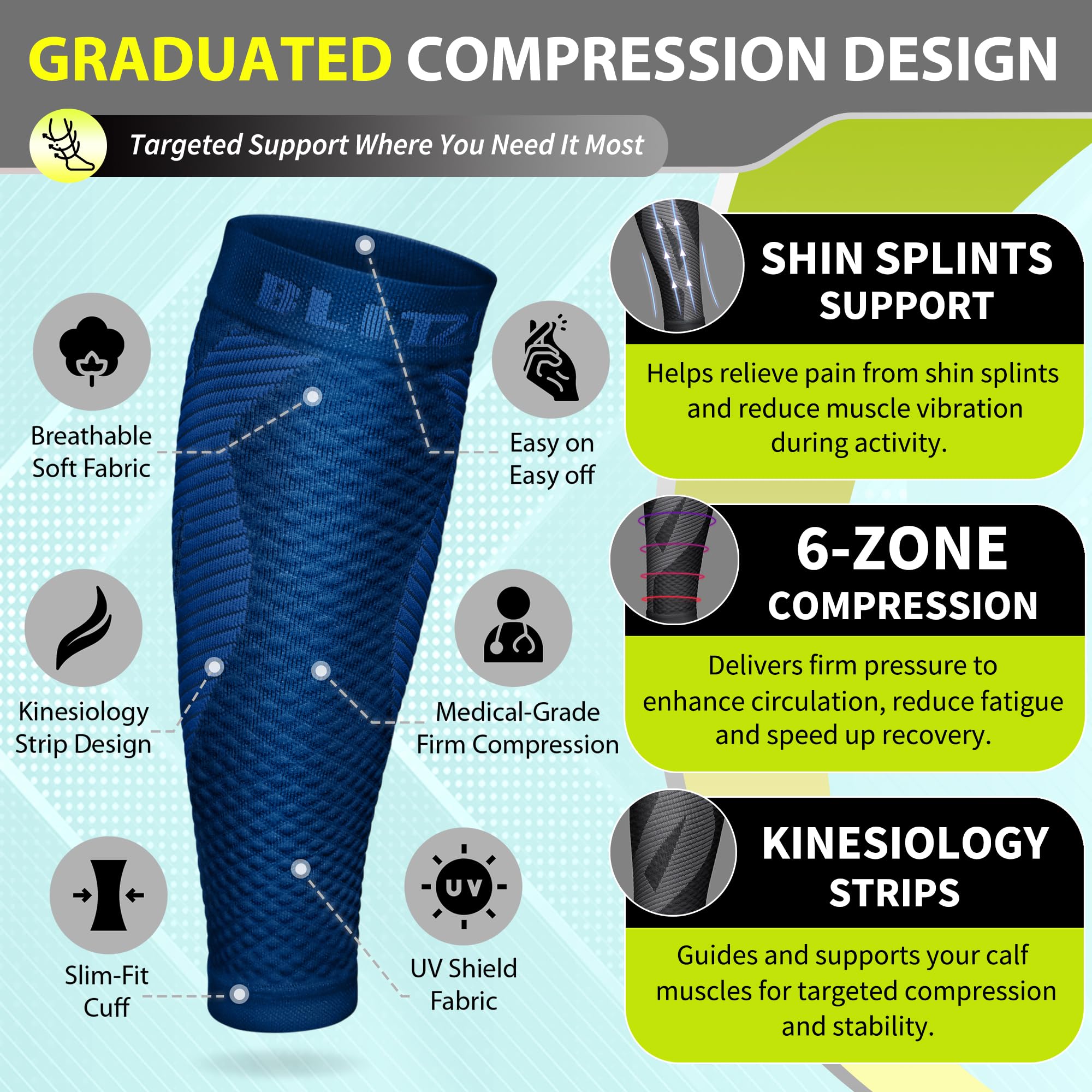Patented Kinesiology Strips for Targeted Pain Relief: Developed and patented in New York, our calf compression sleeves incorporate advanced kinesiology strips that provide superior support, stability, and pain reduction. Designed using the renowned kinesiology technique, these strips promote natural pain relief and accelerate recovery by improving muscle function and reducing fatigue.