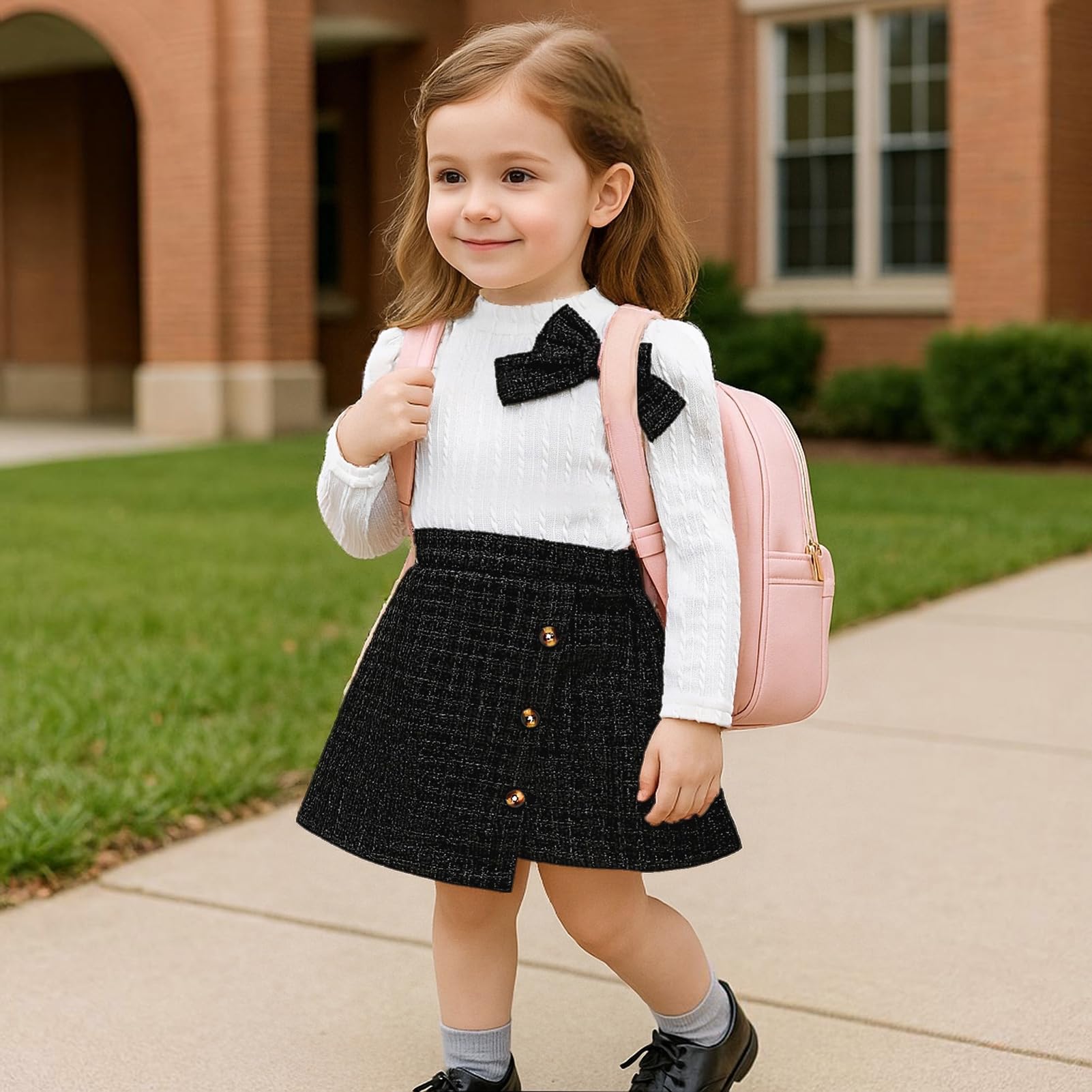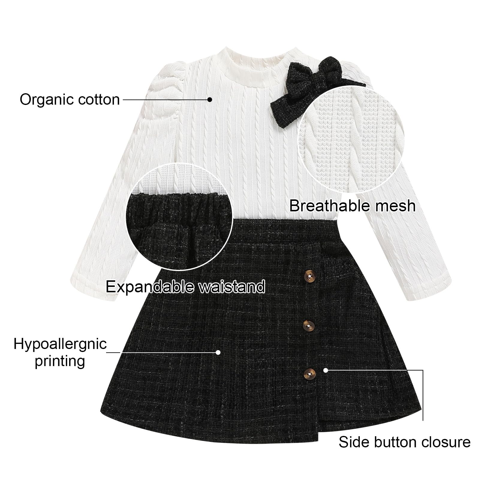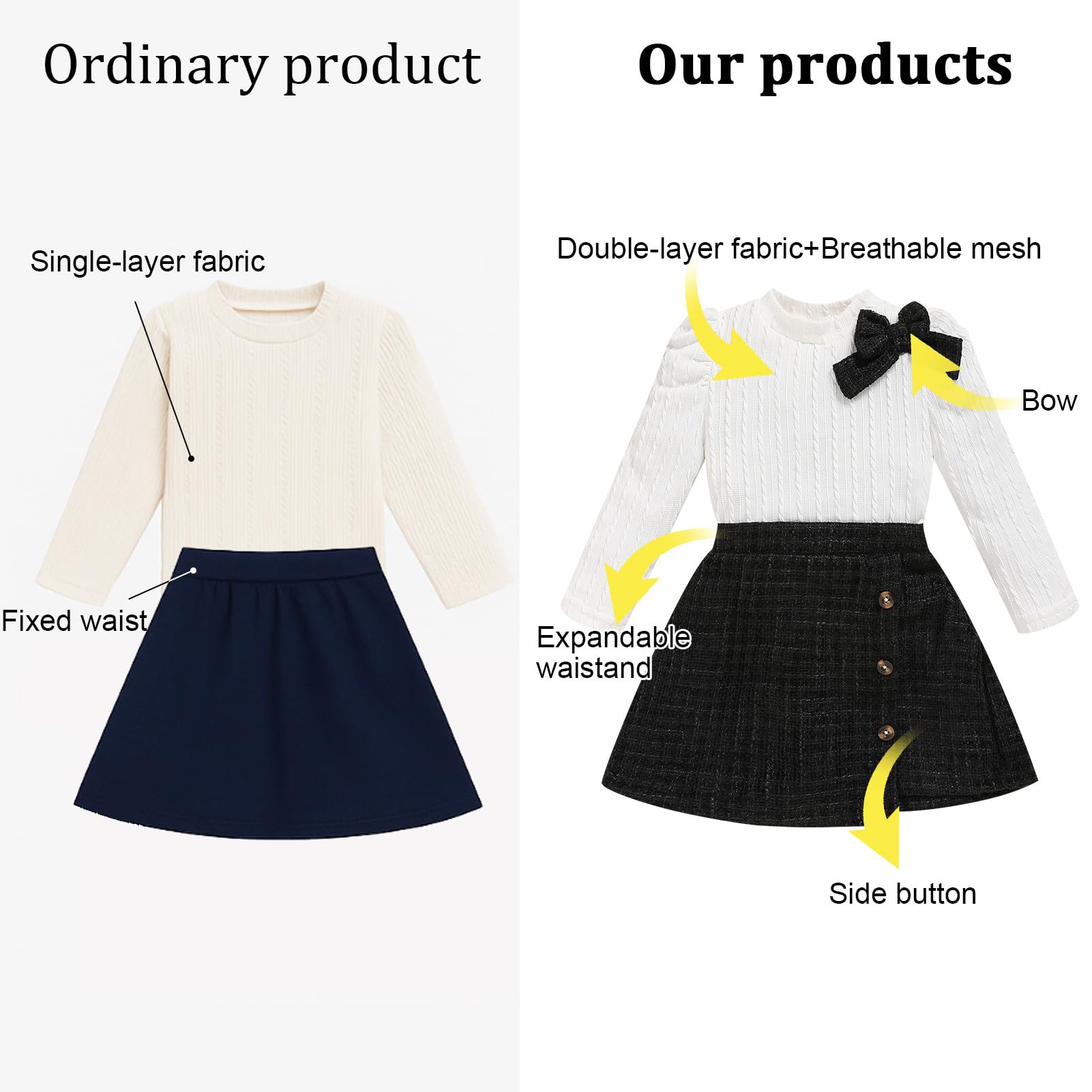 MATERIAL: Toddler girl shirt sweater top is made of cotton and polyester, bottom skirt is made of cotton blend and polyester, soft, breathble, and comfortable, sweet toddler baby girl 2 piece skirt set, cute baby girl clothes.