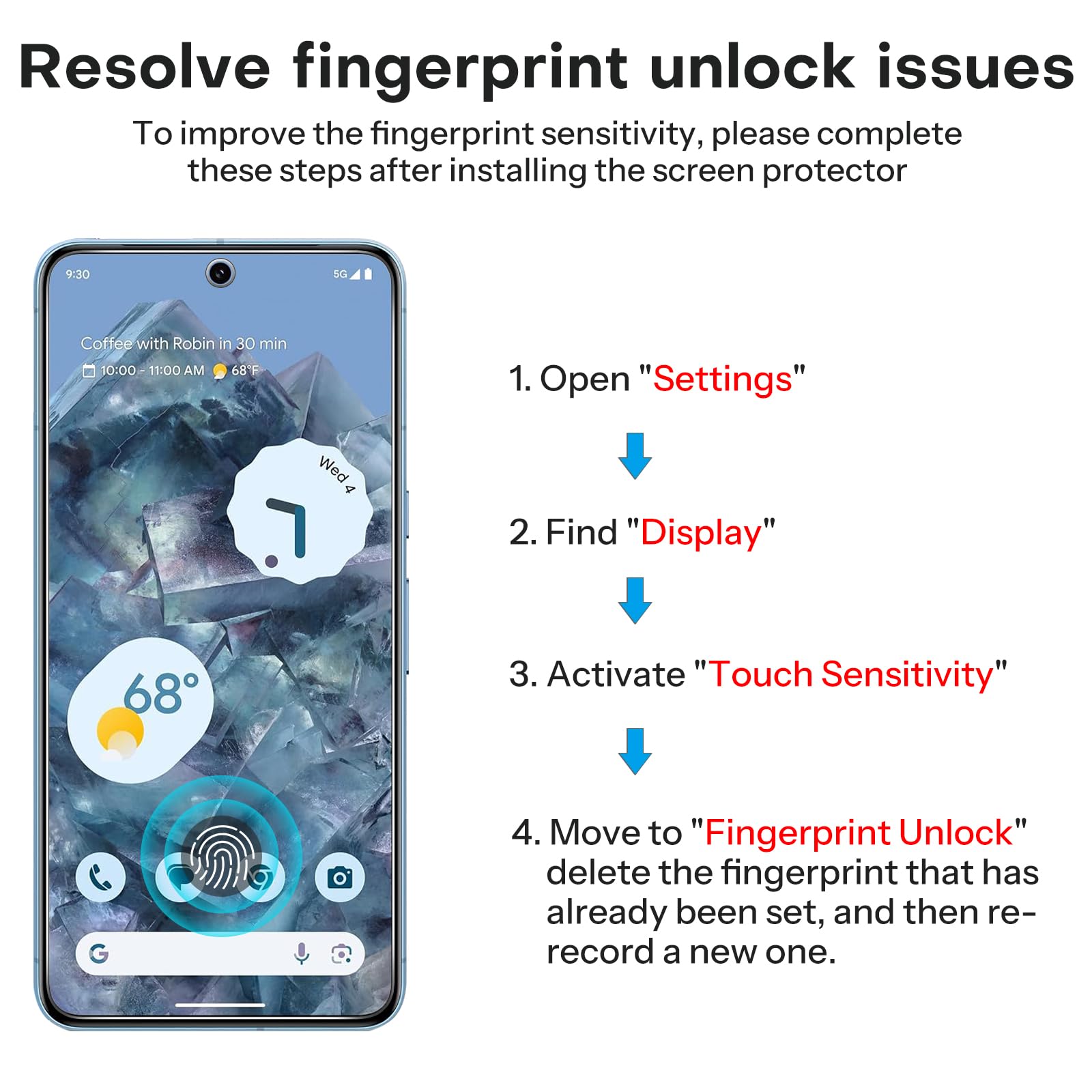 Touch Sensitive: Only 0.33mm in thickness maintains original response sensitivity and touch feeling. (Kindly Note: If the fingerprint doesn’t work after installing the screen protector, please delete your old fingerprint and enroll new one, then it will work)