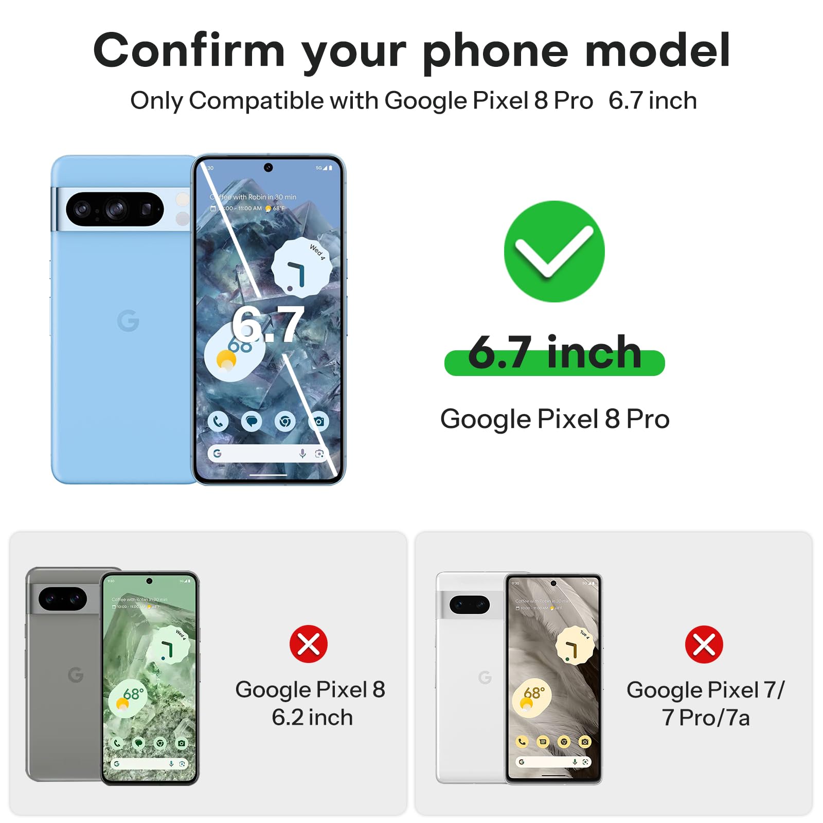 Compatible Model: This screen protector and camera lens protector only compatible with Google Pixel 8 Pro (6.7 Inch, 2023 released), NOT for Pixel 8 (6.3 Inch)