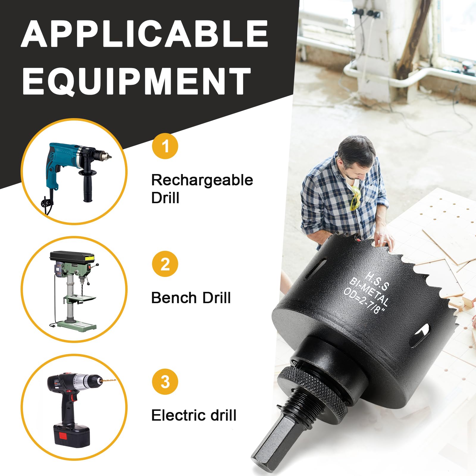 ITOOLFIRM HOLE SAWS for Wood, Metal, Ceiling, Drywall, Fiberglass, Acrylic, Sheet Iron and Steel Frame. Features: BI-Metal + High Speed Steel(HSS) Extremely fast sawing with minimal expenditure of force High concentric and side-stroke precision 7/16” Hex Shank Suitable for Cutting Household wood Plywood Galvanized pipe Fire hose Gypsum board PVC boards Holes in Ceiling for lights Holes for vent or fans Holes in table or wall for cable NOT Recommended for Cutting Masonry/Concrete/Cement Roof Stone Floor Marble/Granite Hardwood Compatible Devices Impact Driver Hand Drill Press Bench Drill Press Cordless Drill Precondition: drill chuck is required INSTRUCTIONS Pre-drill using light contact pressure. Continue drilling with minimal, even pressure. Avoid oscillating while drilling. Allow hole saw to “air” when using with wood and wood alternatives. The saw comes to a complete stop on your material before pulling it away. Miss Parts Problem: Each hole saw is coming with a drill bit and shank, if you have revceived a product from our store without the parts, please return or replace your order. HAVE ANY PROBLEM, PLEASE CONTACT US FIRST, YOU’LL NEVER REGRET MAILLING US!!!