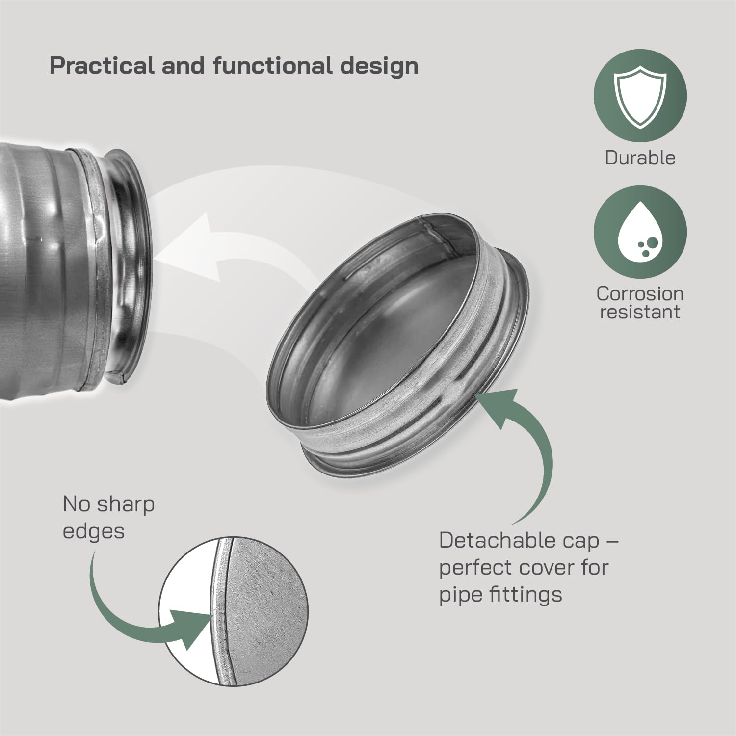 SAFE DESIGN WITH NO SHARP EDGES – Engineered with smooth, rolled edges for safe handling. Detachable cap fits snugly over the pipe end and stays firmly in place when fastened with a clamp (not included).