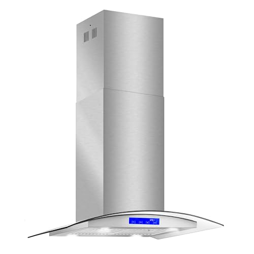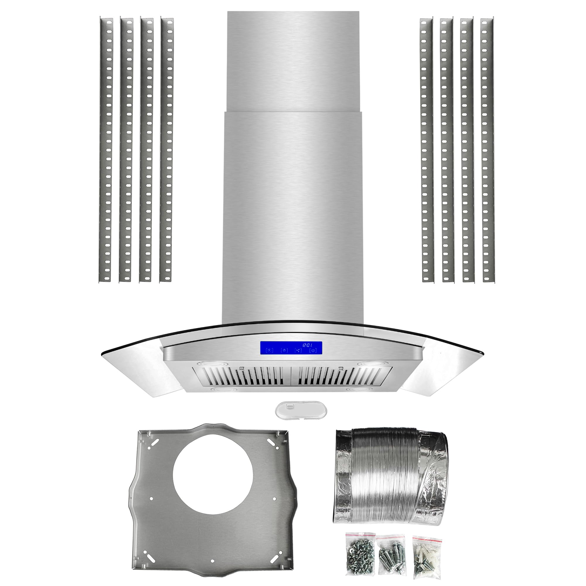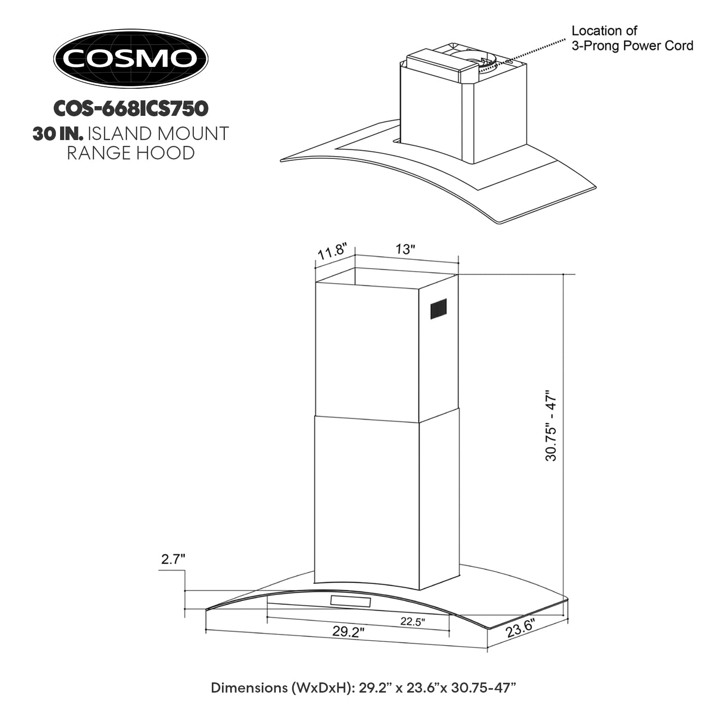 Presenting the newest addition to the Cosmo line of stylish professional filtering systems. This 30 inch stainless steel island mount range hood is in a class of its own. Coveted by kitchen design experts for its sophistication and ultra-modern aesthetic that seamlessly complement a variety of kitchen designs. Its modern features include commercial grade 430 stainless steel and an efficient 380 CFM centrifugal motor dedicated to ridding your house of lingering aromas. Dishwasher-safe premium stainless steel baffle filters to trap grease and oil. 4 x 2W LED lighting to illuminate your cooktop.
