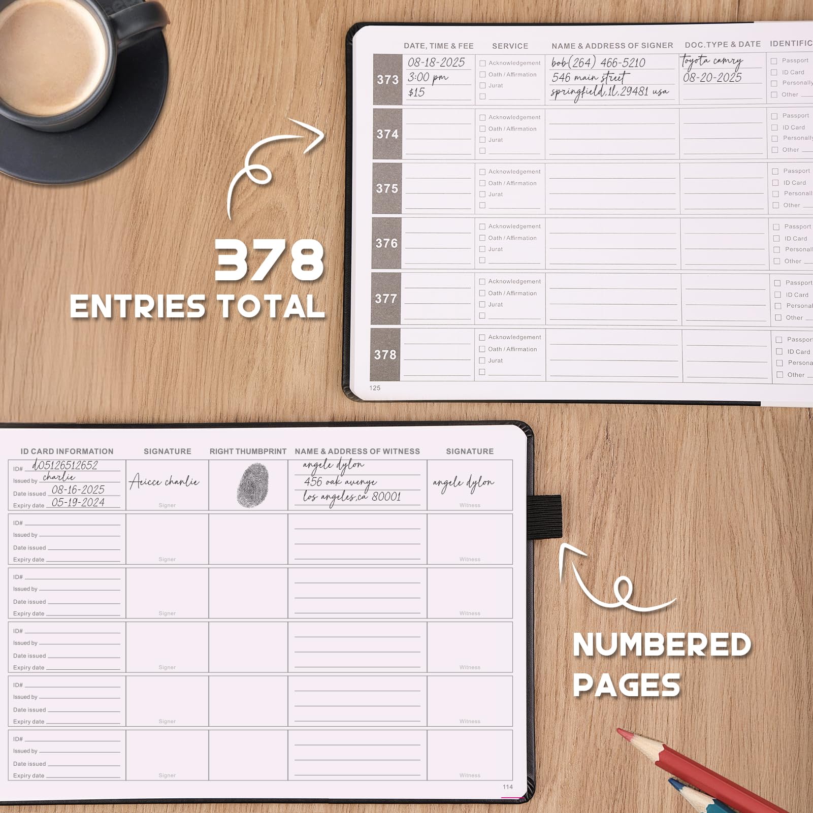 *Ultra-Organized Entry System* Each entry provides clearly labeled sections for all essential information: signer contact details, ID verification, thumbprint area, witness info, and extra notes. The intuitive layout saves time while ensuring no crucial details are missed