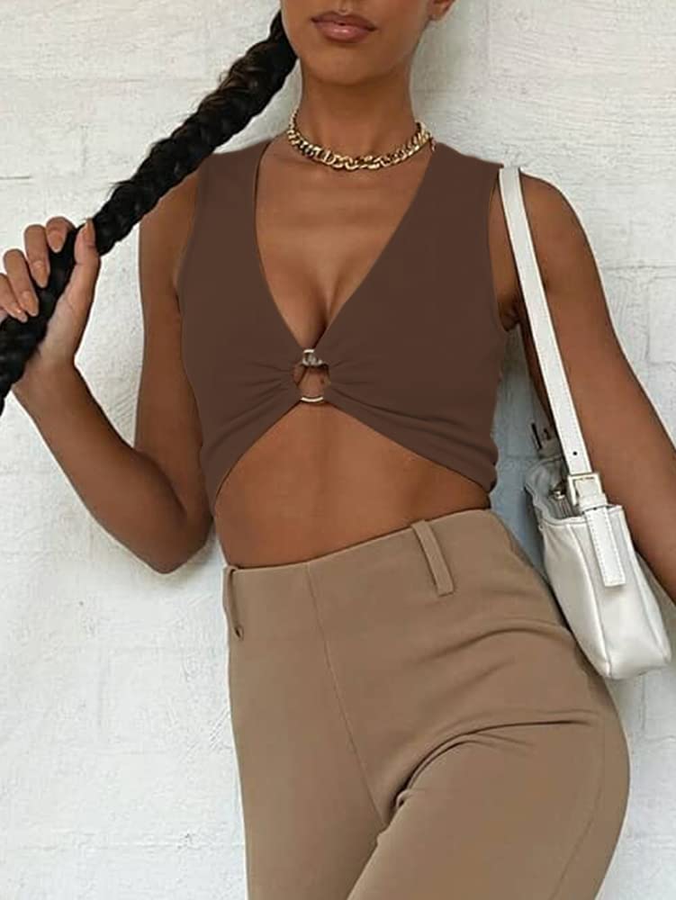 Design of the deep v neck and the silver ring center piece keeps the y2k top away from the ordinary. This cute tops can go well with jeans, shorts and high heels well