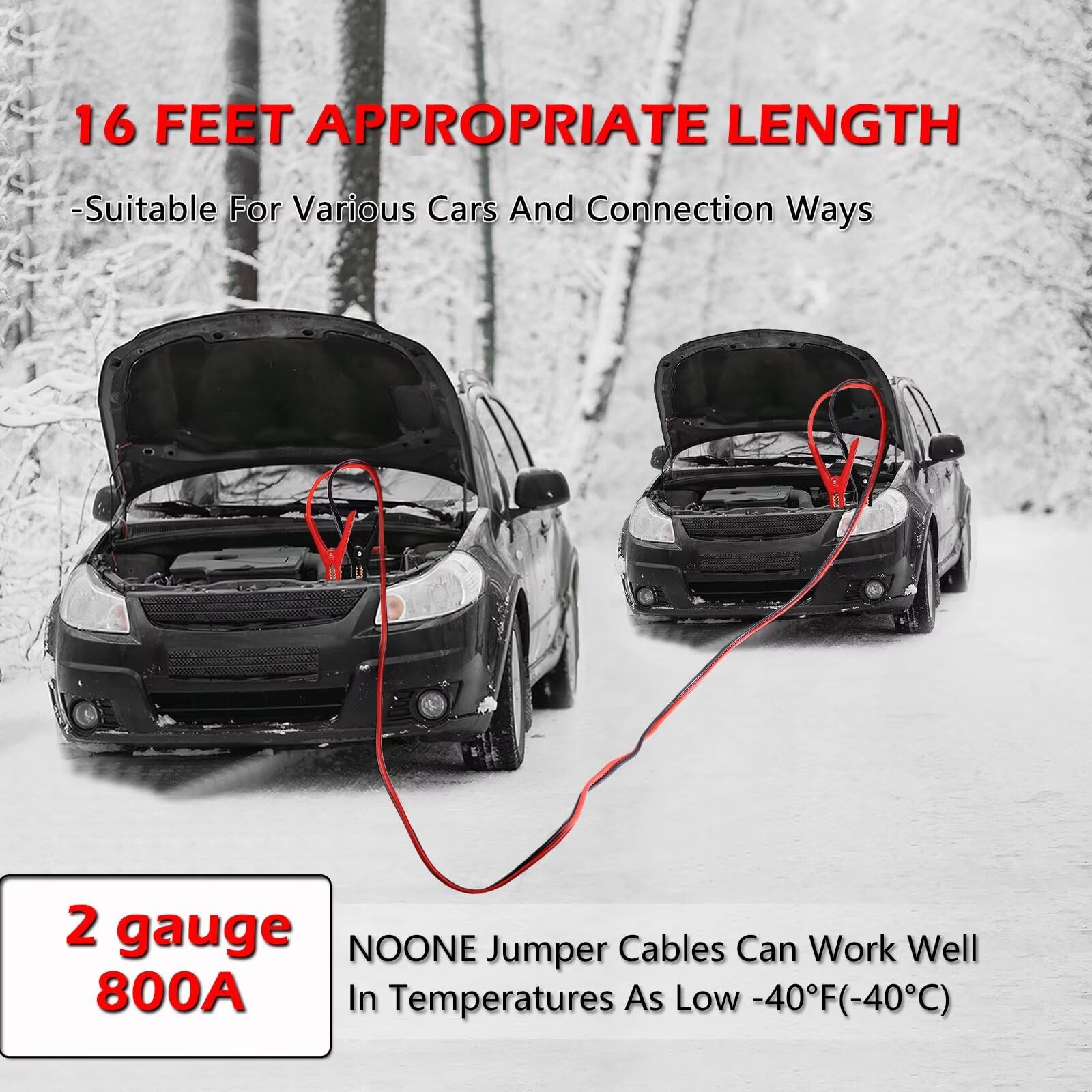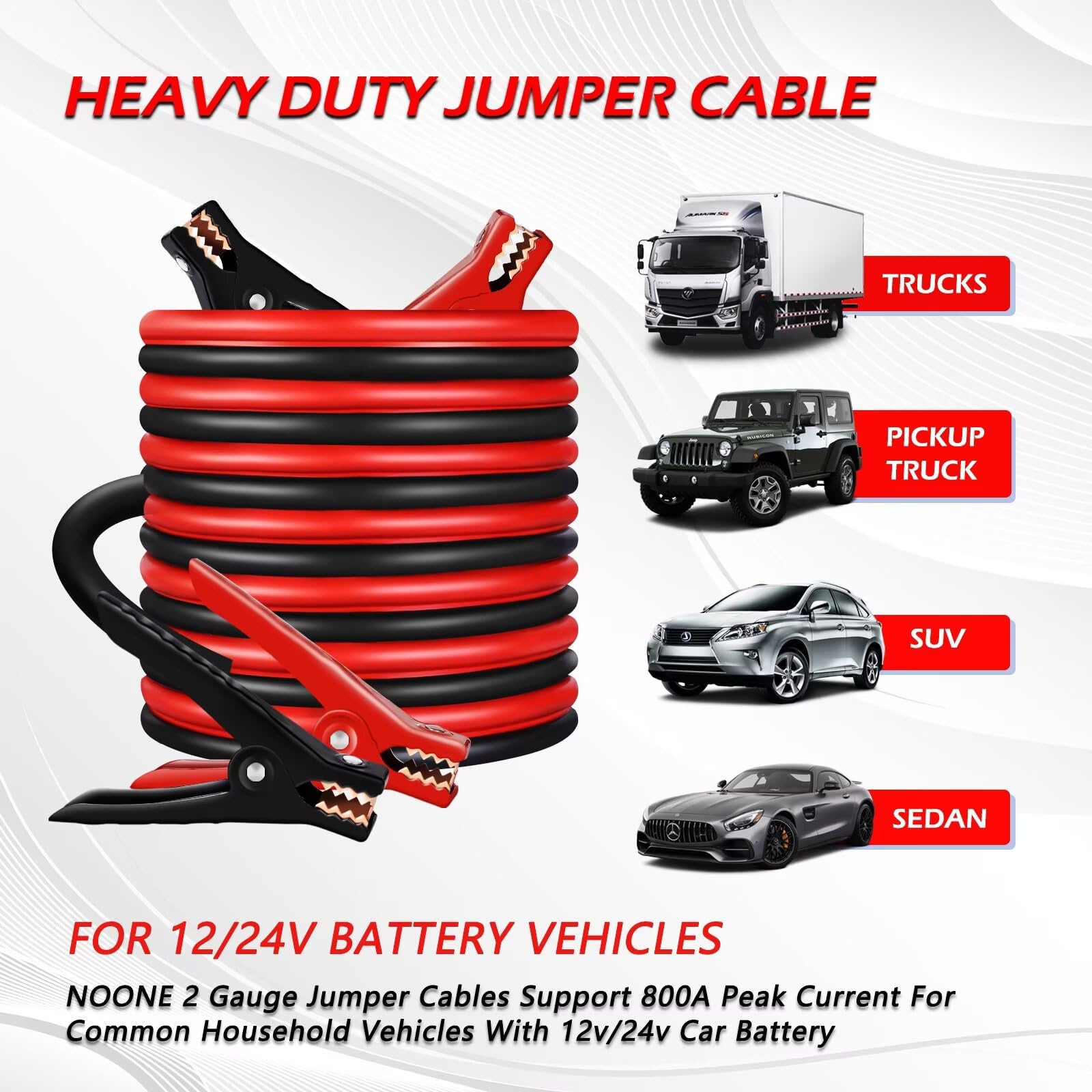 NOONE 16 FEET JUMPER CABLES : 2 Gauge, 16 feet booster battery jumper cables for jump starting dead or weak batteries. Ideal for trucks, SUVs, full-size cars, mid-size cars, and small/compact cars