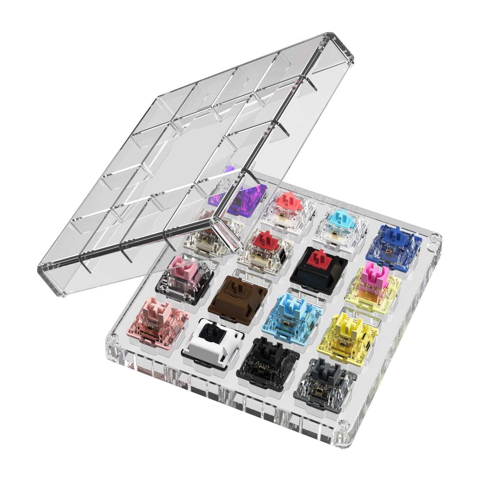 Try before you buy – MonsGeek x Akko acrylic 16-key switch tester with dust-proof cover-With a wide range of different switches including tactile and linear and clicky key switches from 3 different brands for users to test at minimal cost.