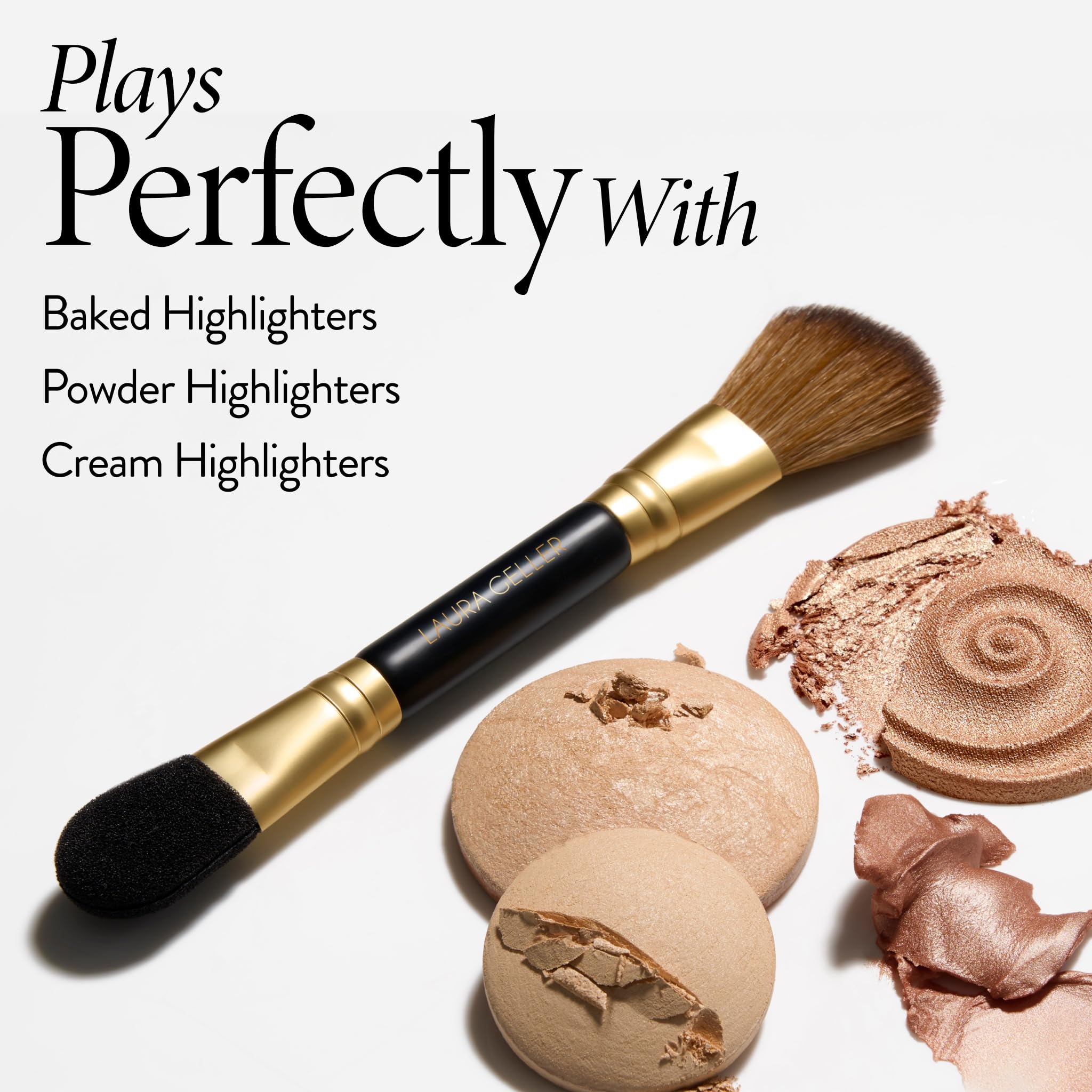 TWO BRUSHES IN ONE: Get an intense glow or more softer, subtle dimension with this double-duty highlighting brush! The silky satin paddle packs on the glow with your favorite highlighters, while the fluffy bristles help diffuse color.