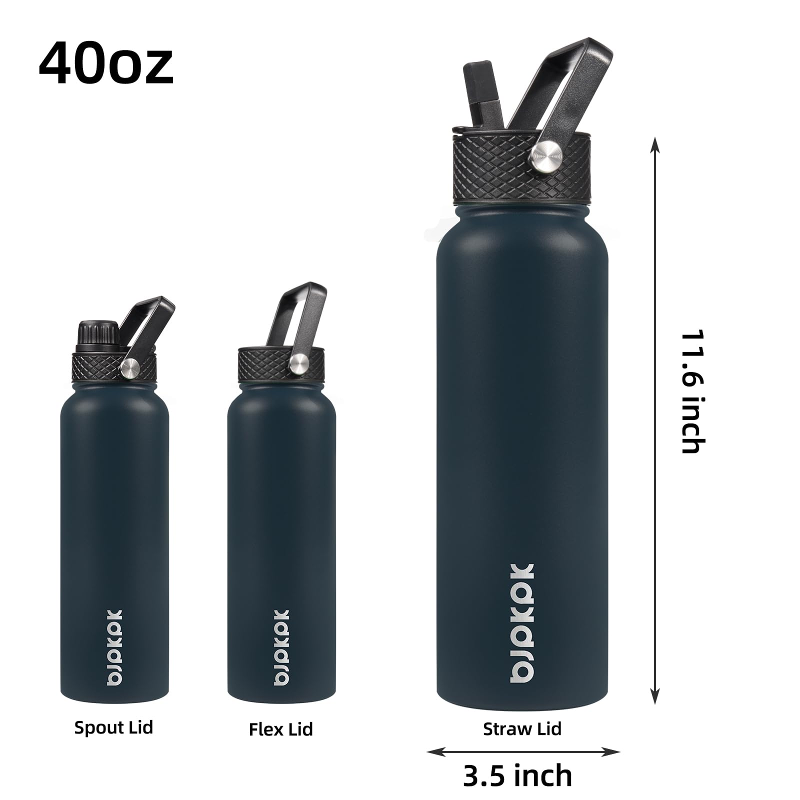 BJPKPK Insulated Water Bottles with Straw Lid, 40oz Stainless Steel Water Bottles with 3 Lids, Large Metal Water Bottle, BPA Free Leakproof Thermo Water Bottle for Sports & Gym- Navy Blue