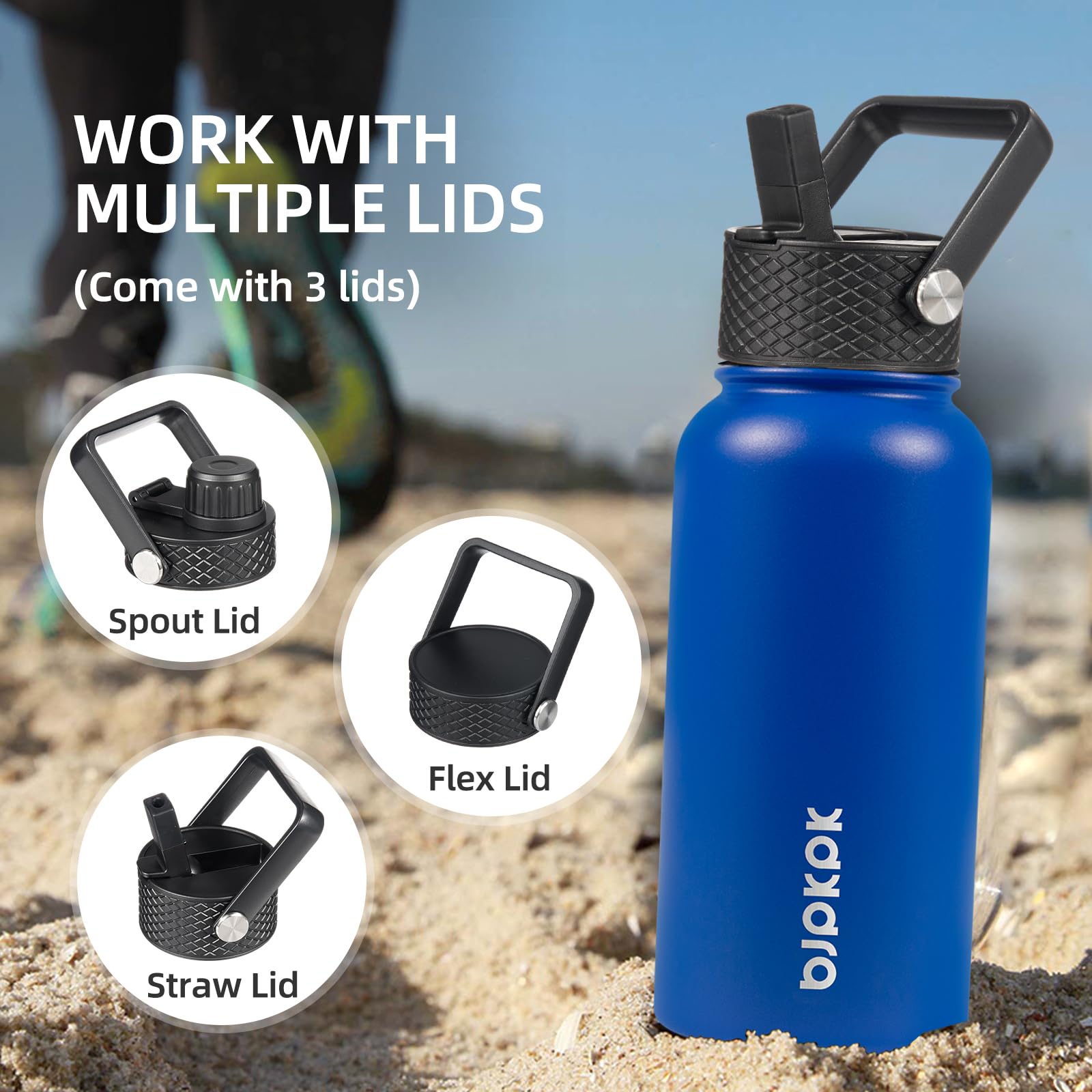BJPKPK metal water bottle comes with 3 different lids options. Straw lids for iced beverages. Spout lids for hot water. Flex removable lids for drinking smoothie or fruit drinks. All of the 3 lids are convenient to carry, BPA FREE and leak proof
