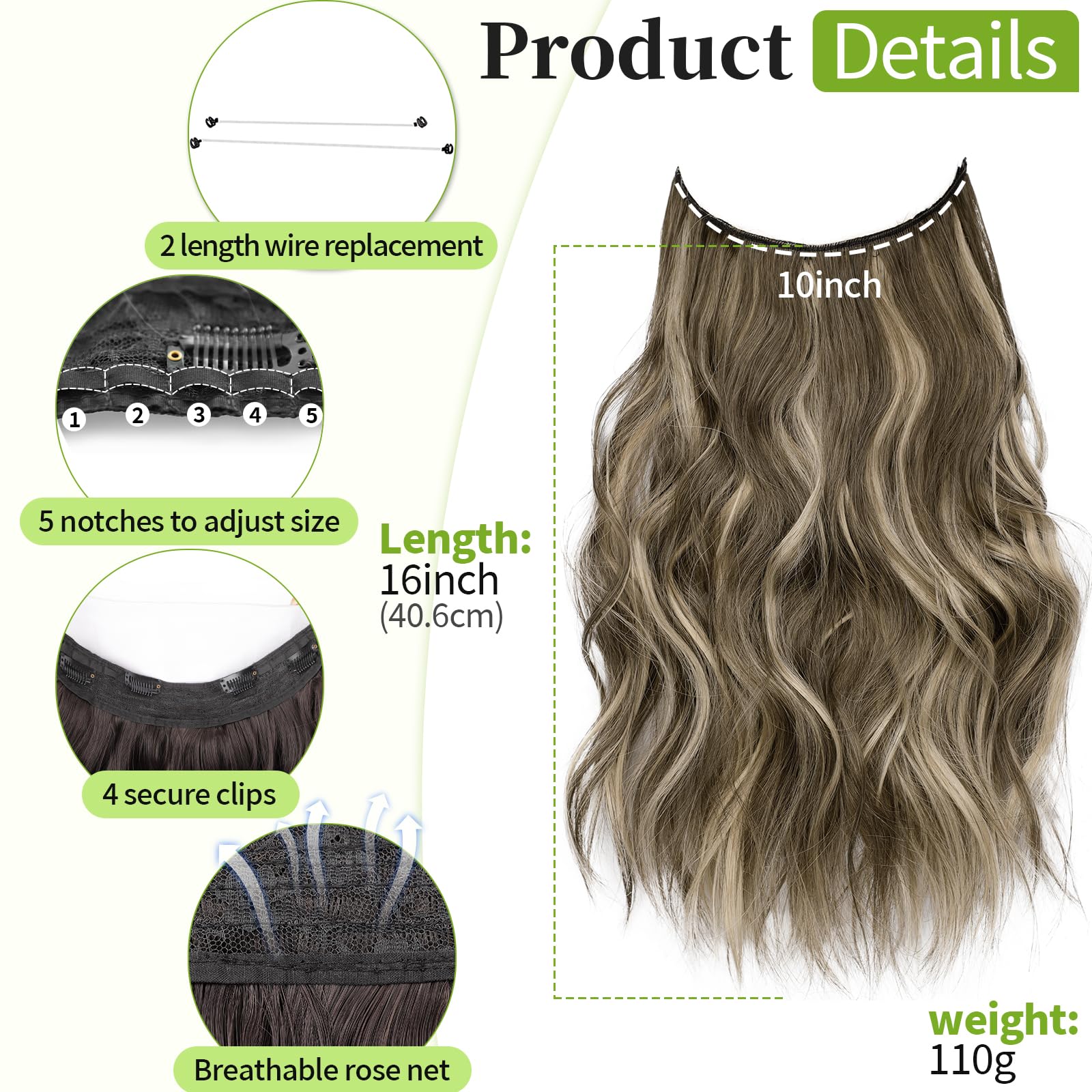 Specifications: Each package includes a hair piece containing 4 clips; 2 different lengths of fishing wire for replacement; You can adjust the suitable size according to your head circumference by putting the hook into the corresponding wire notches. The upgraded wire is thicker and more flexible, not easy to break and will not cause any stress to the scalp.
