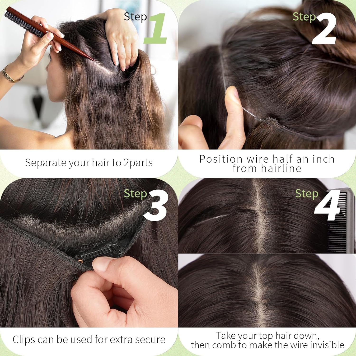 Different ways of wearing: 1. Position the wire hair extensions on your head like a hairdband, secure them with 4 clips, and hide the wires with your own hair.2. Only use invisible wires, suitable for easy hair loss and sensitive to bobby pins customers. 3. Only use 4 hair clips, suitable for customers with soft and sparse hair on the top of the head.It can meet various wearing situations.