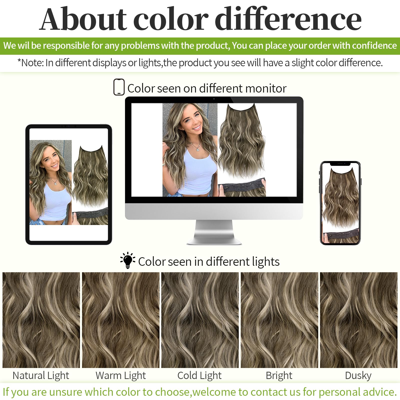 Warm Tips :All pictures are taken by us. Please note that there will be color differences in hair under different lights or monitors. If you are not sure which color to choose, we will be happy to help you match the color.