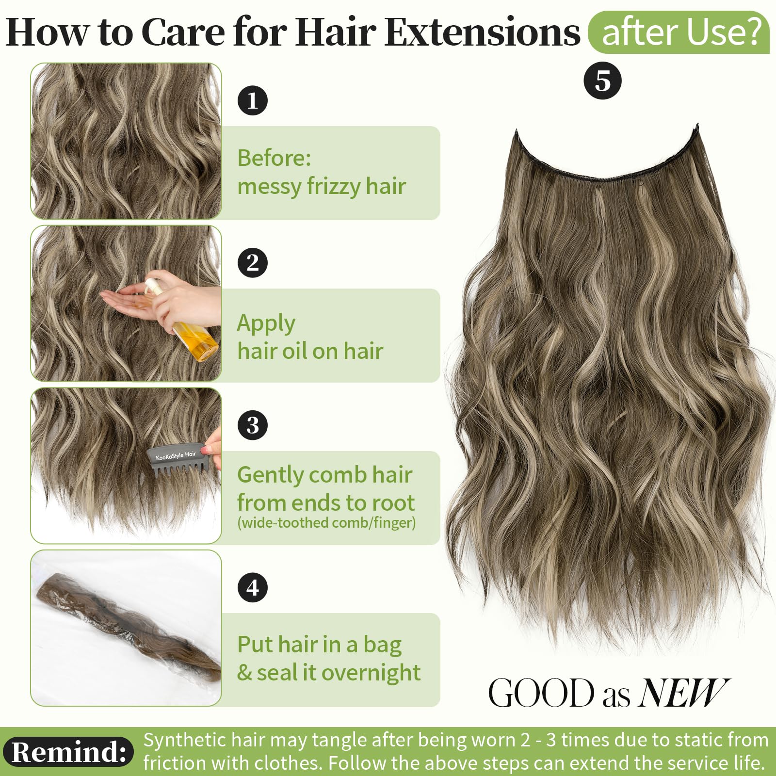 Care Tip: Unlike your own hair, hair extensions can tangle without nutrients. You can use detangle spray or get a spray bottle and put some conditioner in it and add water. If there is no conditioner, just spray some water, it will make the hair extensions not very dry and prevent tangling.