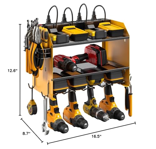 Very convenient for charging your tool batteries, All-in-one design and the metal power strip with surge protection of 1200J, Able to protect your device to a certain extent. Utility rack size: L:16.5in * W:8.7in * H:12in.
