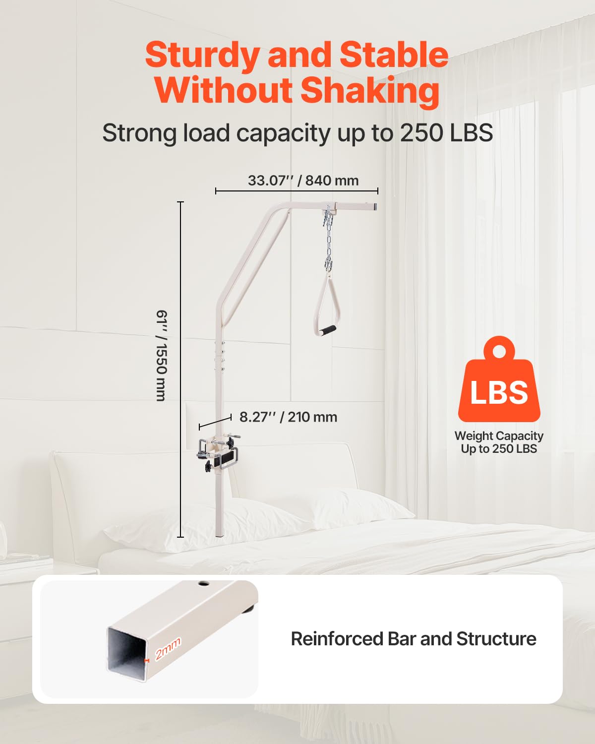 Robust and Stable: Designed for stability and support, this trapeze bar for bed mobility is built with heavy-duty Q195 steel frame, providing strong load capacity up to 250 lbs. The reinforced rod at the top enhance structural strength, preventing wobbling or tilting, and providing stable assistance for patients to get up and reposition.