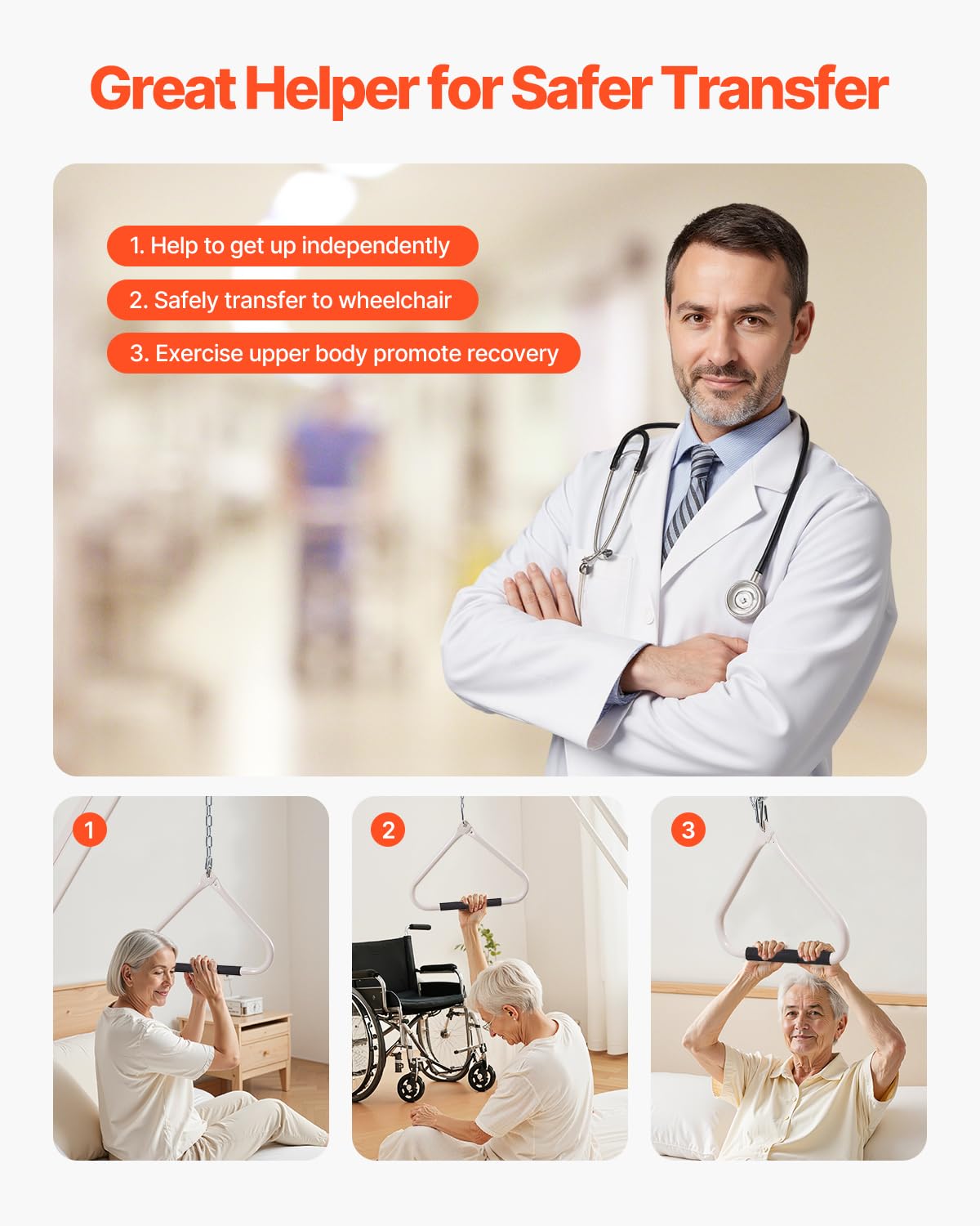 Enhance Daily Mobility: Ideal for seniors, pregnant women, and those with limited mobility, this trapeze bar with clamps enables safe transfers to a wheelchair or helps with getting in and out of bed independently. It also can function as a workout tool to strengthen upper body and promote recovery, helping them live more independently and confidently.