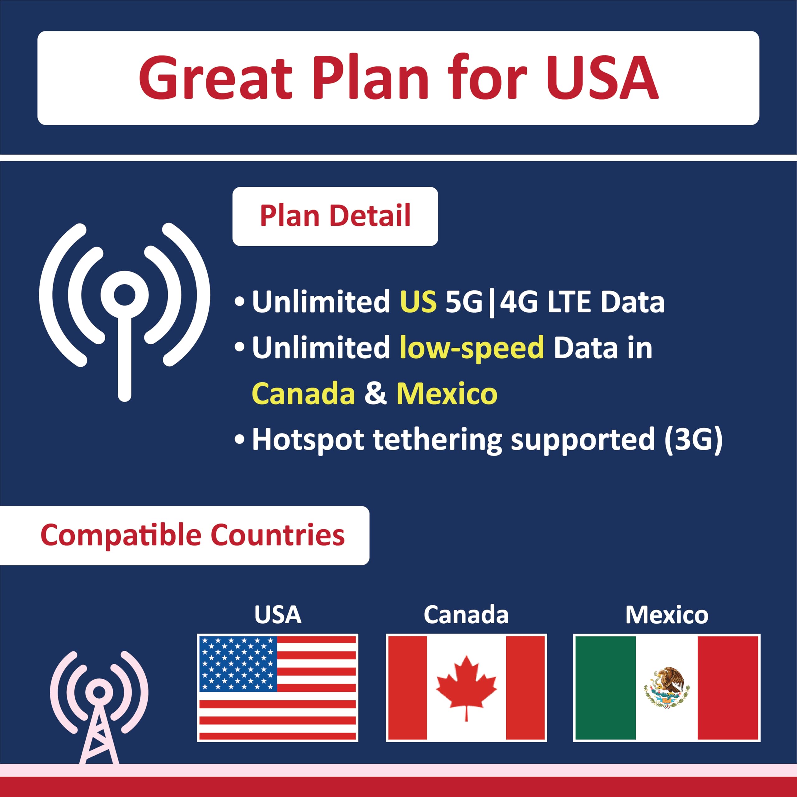 Data Plan: Valid for 9 Days. Unlimited 5G | 4G internet Data in USA nation-wide (Hawaii is included) + Unlimited low Speed Data in Canada & Mexico. Hotspot tethering is supported (3G).
