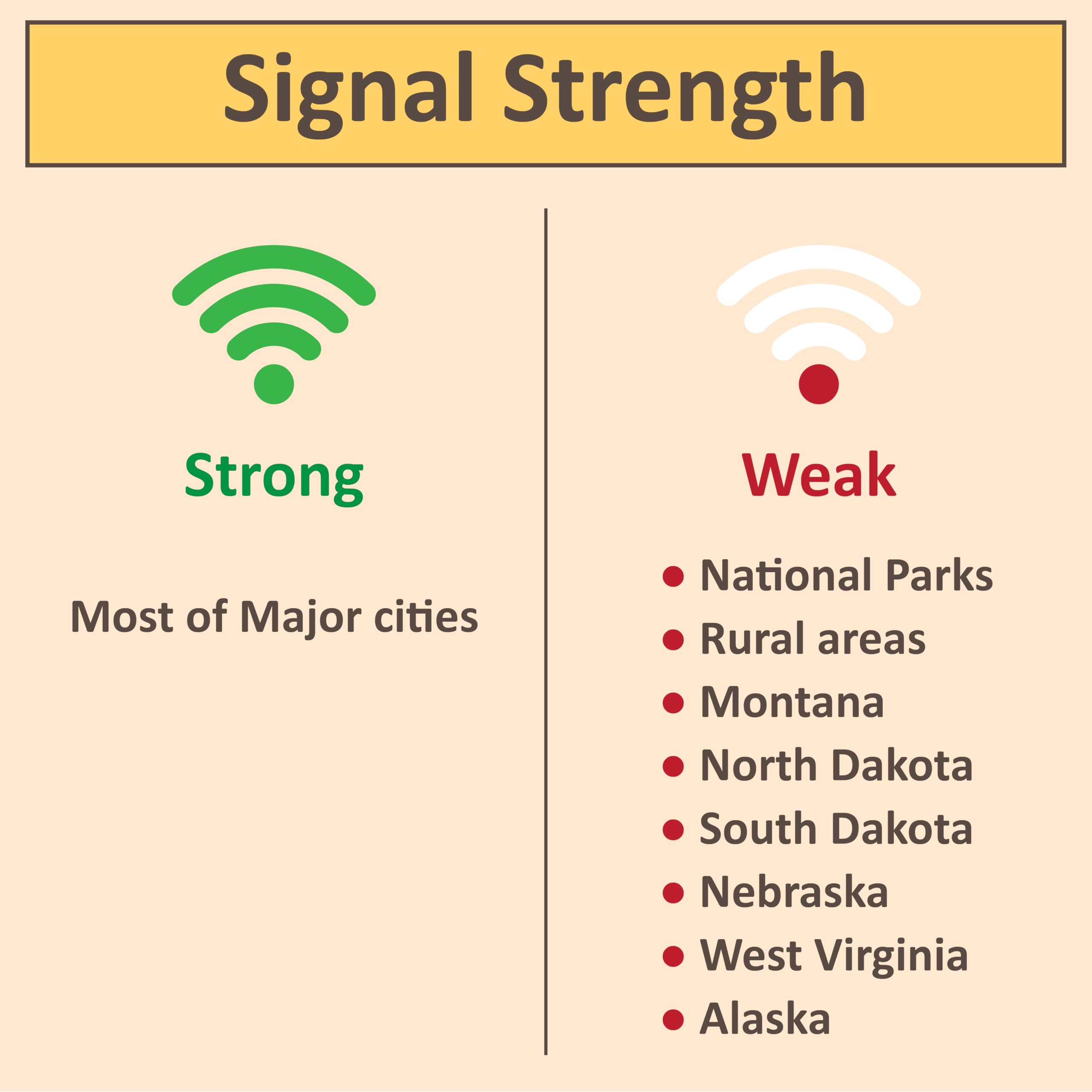 Weak signal strength regions: National Parks, Rural areas, Montana, North Dakota, South Dakota, Nebraska, West Virginia, Alaska.