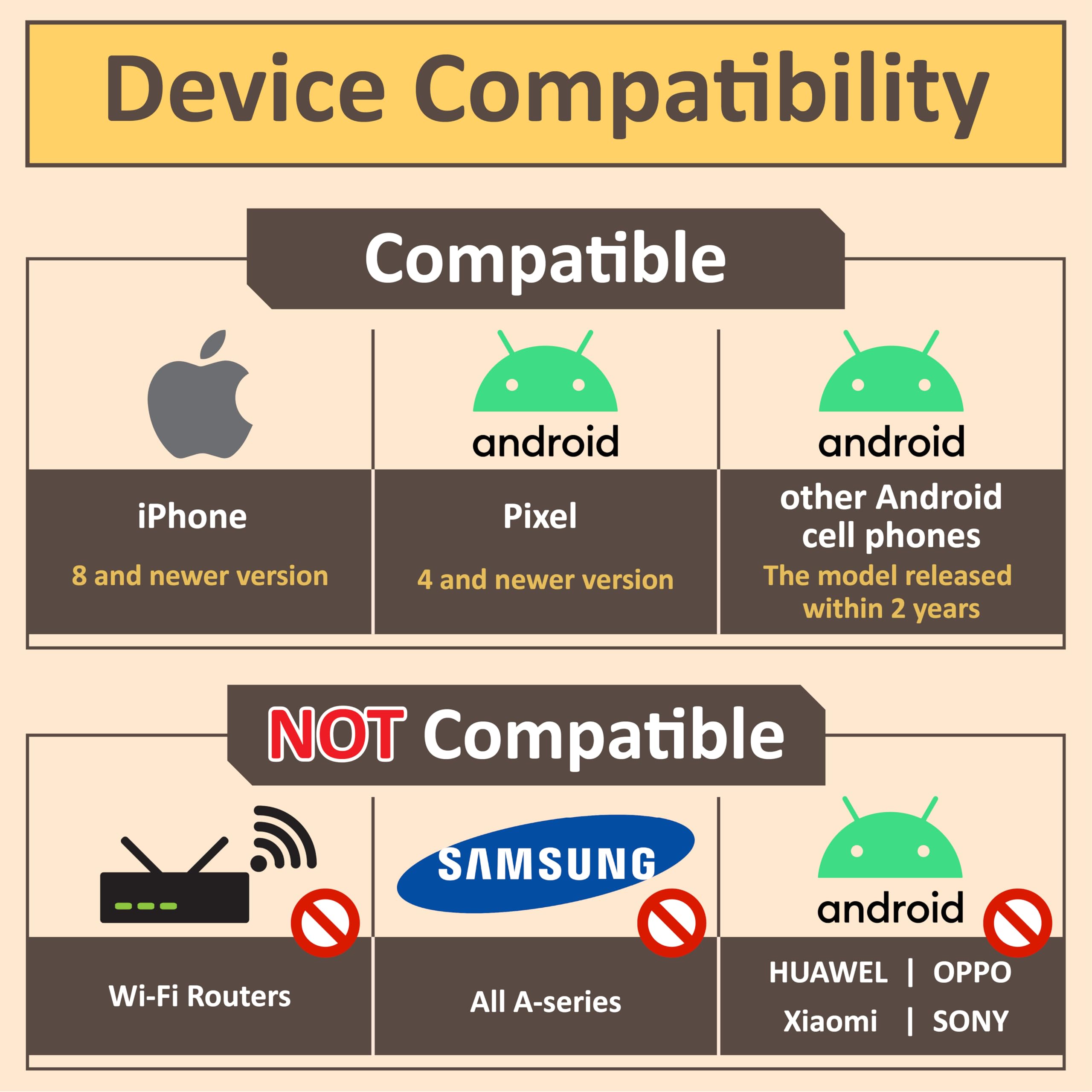 Smart phones ONLY. Samsung A series (A40, A50, A51, A70 etc.) and China brand (HUAWEI, OPPO, XIAOMI etc) & SONY are NOT fully compatible. Plus,🚨please make sure your device works on T-Mobile's network, Band 2 and Band 4, otherwise it won't be working.🚨