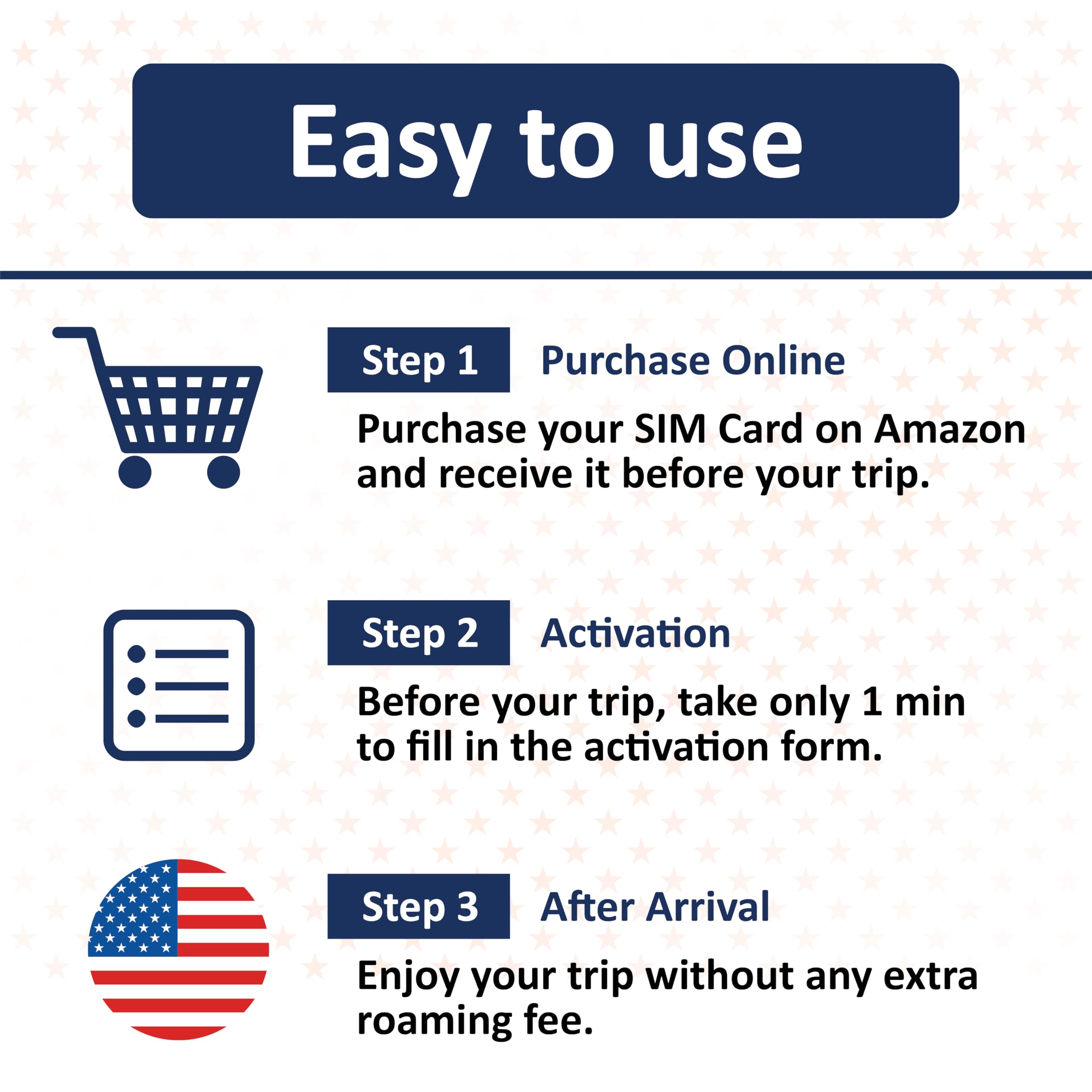 US Prepaid SIM for 9 Days. This product is a local US sim card. Plan Details Data Unlimited 5G | 4G High-Speed Data in USA nation-wide (Hawaii is included). Unlimited Low-Speed data in Canada and Mexico. Phone Calls and Texts Unlimited Calls and Texts among United States nation-wide (Hawaii is included), CA and Mexico. Phone Number The SIM comes with a local US phone number You will get the local US number the day before your scheduled activation date. 1 Easy Step to activate your SIM card Simply fill in activation form 3 days before your departure, you will be able to enjoy the sim upon arriving with NO extra roaming fee. Device Compatibility Customer Service Support Local English Customer Service supported. Special Notice Make sure your phone is UNLOCKED. SIM activation during weekends and US national holidays may be delayed.(GMT+8) The plan is refillable. This product is NOT compatible with Wifi hotspot devices, pad phones, and Carrier-Locked phones. Please note that Sim2Roam will not be responsible for any problems due to device incompatibility.