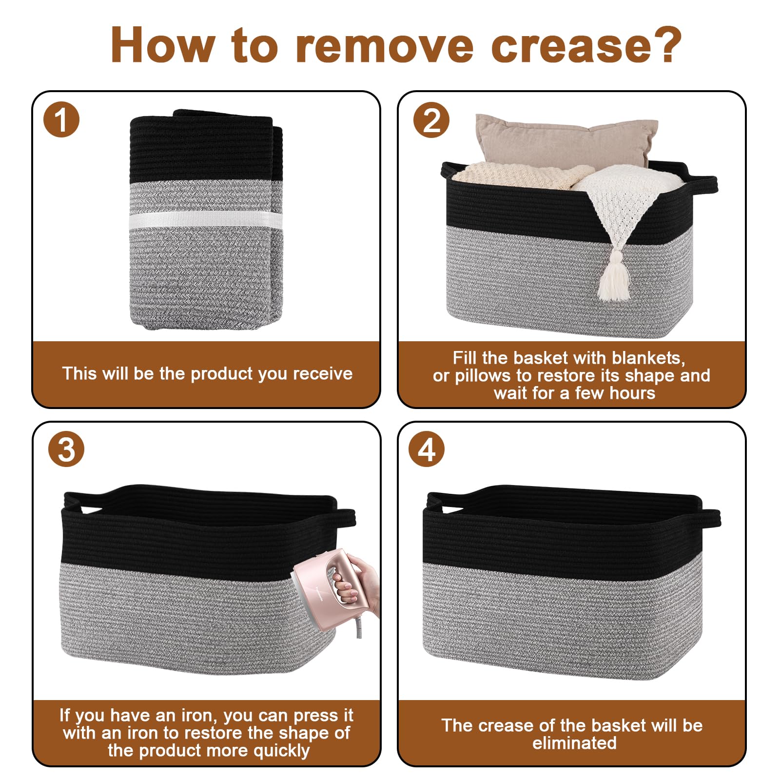 Note: The woven basket are folded for shipping. Filling it up with towels or blankets could help it return to its best shape. Fast smoothing the creases by ironing them. The rope basket is hand and machine-washable. It's built for long-term use