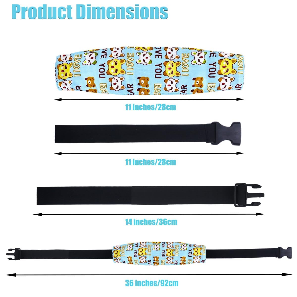 Specifications: This baby head support band is designed for sleepy baby and kid, appropriate to the child's head support, head protective, relieves neck strain for sleepy. Material: cotton Package includes: 3 pcs blue carseat head support band in 3 different pattern (Elephant, Bear and Rabbit) Size: as picture shows Color: as picture shows Notes: The colors may exist slight difference due to different screens. Manual measurement, please allow slight errors on size. Adjustable design, suitable for children of different ages.