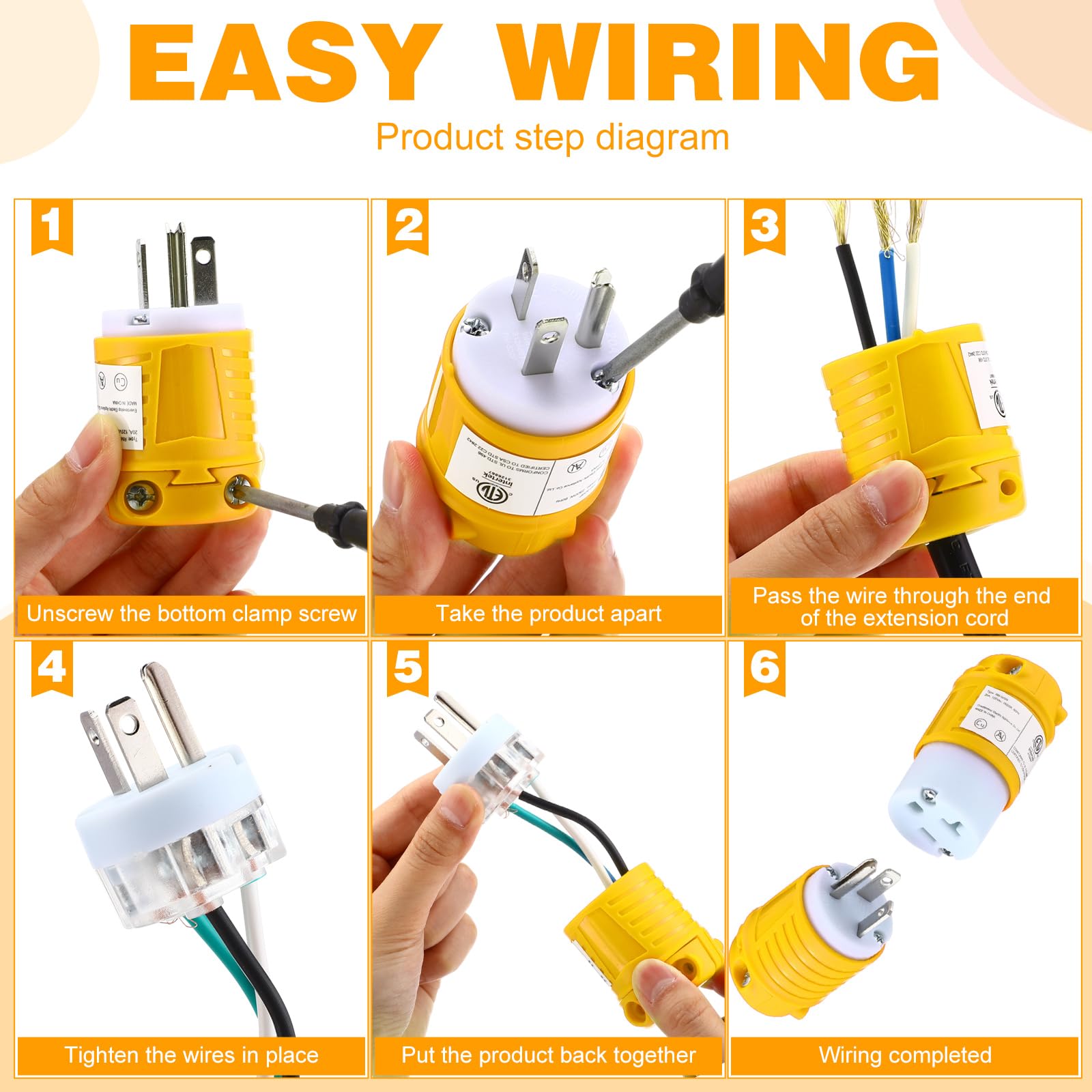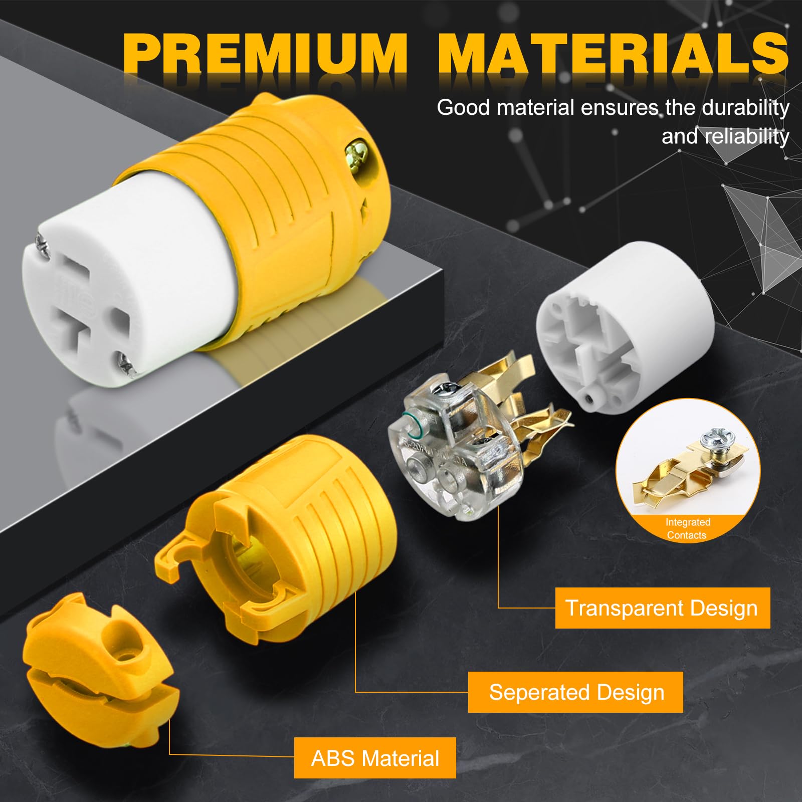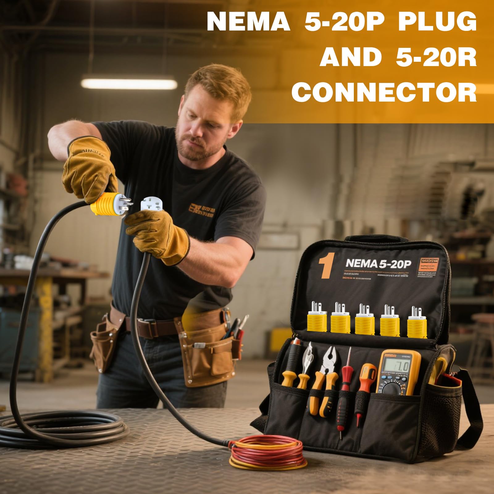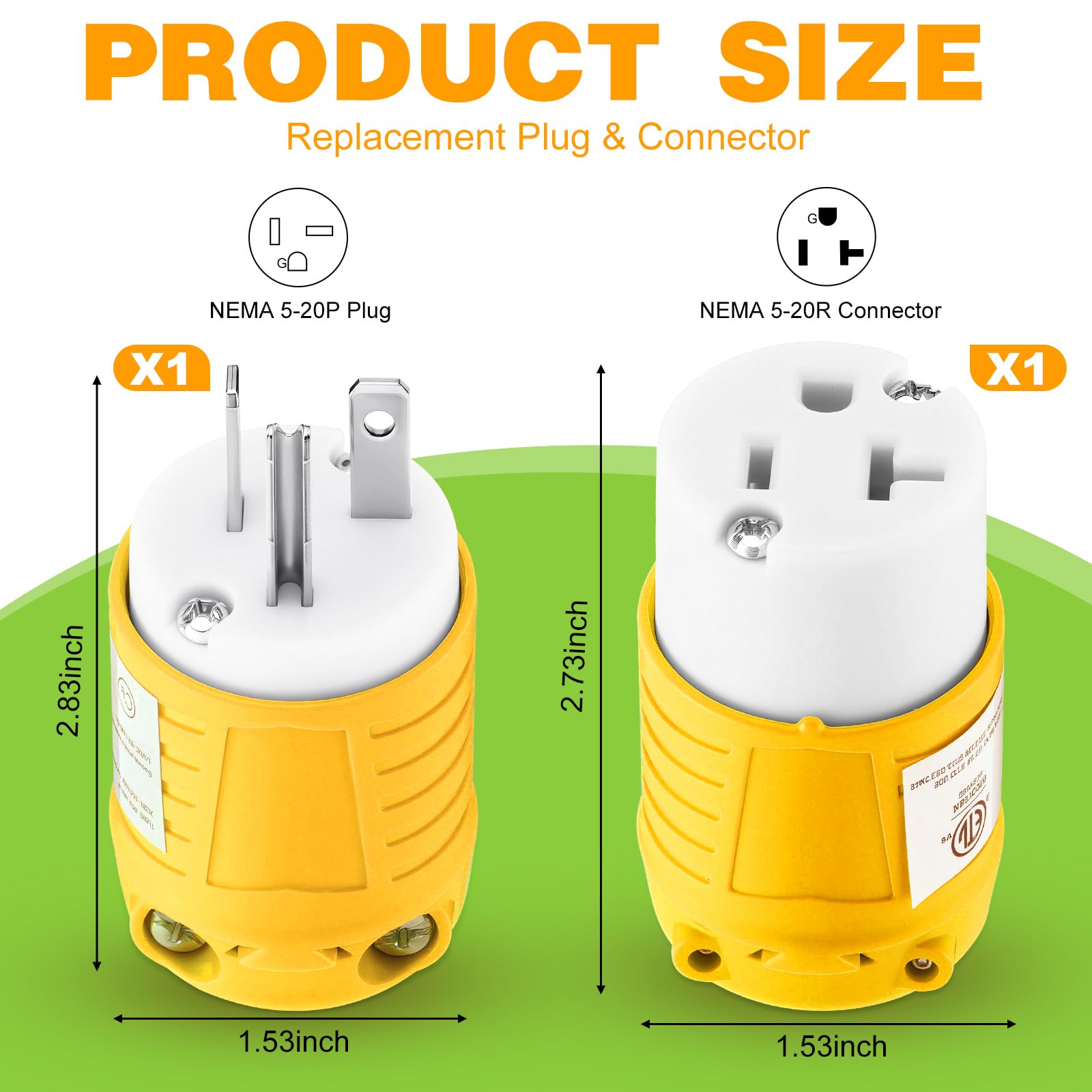 Packing Include: 1pcs 20Amp 5-20P male plug and 1pcs 20Amp 5-20R female plug, rated for 125V 20A; This set is ideal for replacing old or worn out receptacles on 6AWG/3C + 8AWG/1C RV extension cords and is suitable for use with welding machine, RV, EV, etc