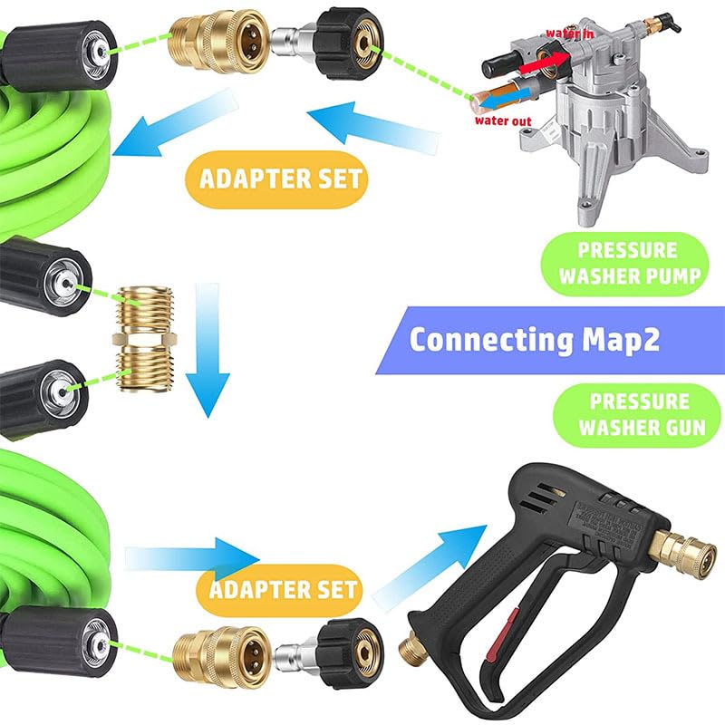 Easy to assemble: High replacement couplers provide secure and quick fittings, easy to connect and disconnect. Two quick connectors connect the pump outlet to the pressure washer hose or the cleaning hose to the gun.