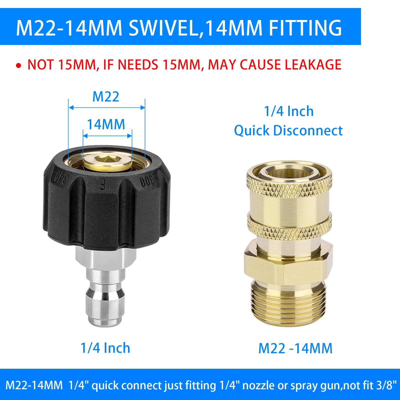 Package Includes 2 Pair M22 (M22-14MM) 1/4'' Quick Connect, 2PCS M22 14mm Plug +2PCS 1/4inch female quick disconnect it's fitting 1/4nch nozzle or spray gun,not fit3/8inch.