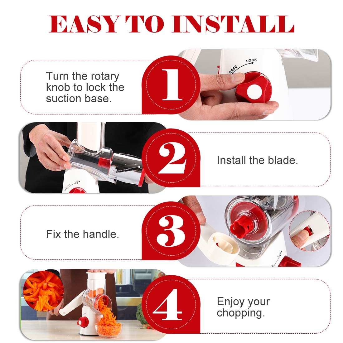 Three Blades: Coarse shredding blade, fine shredding blade with different diameter ; One slicing blades; A pound of cheese is only 30 seconds, avoid contact between fingers and blades