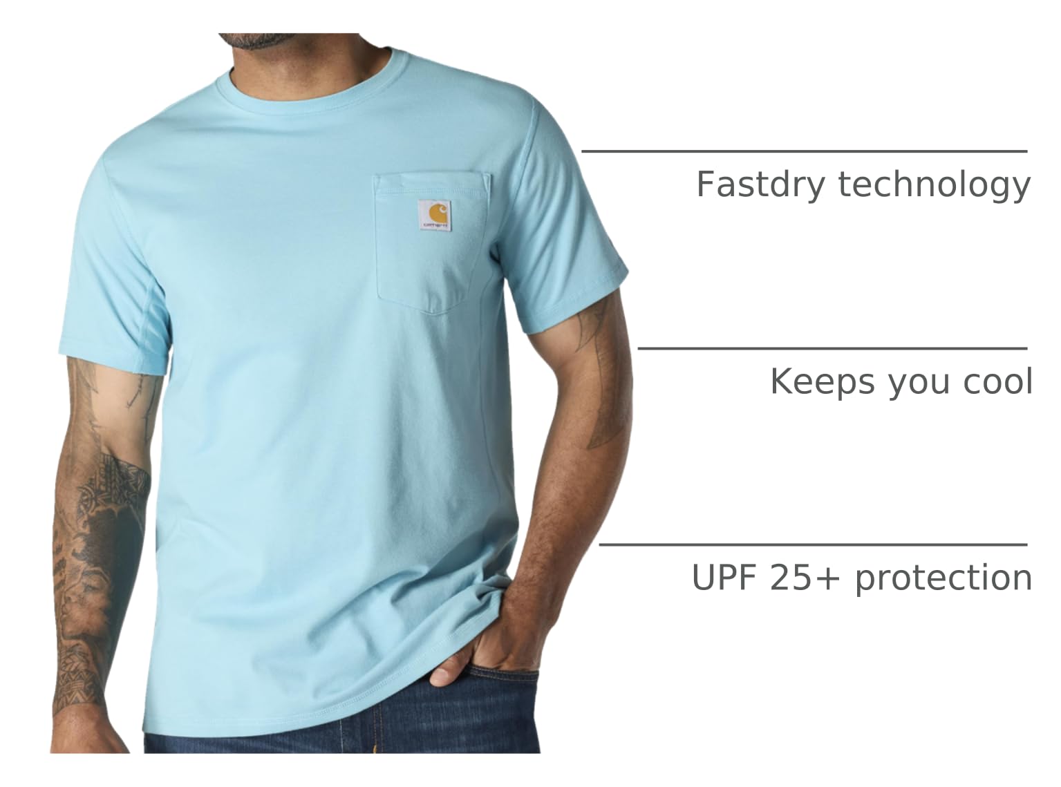 Description On the job or under the sun, this men's Carhartt t-shirt keeps you cool and comfortable. UPF-rated jersey fights off sweat and dries fast so you can stay focused on the task at hand. Ventilated panels keep the air circulating, and a drop-tail hem provides extra coverage.