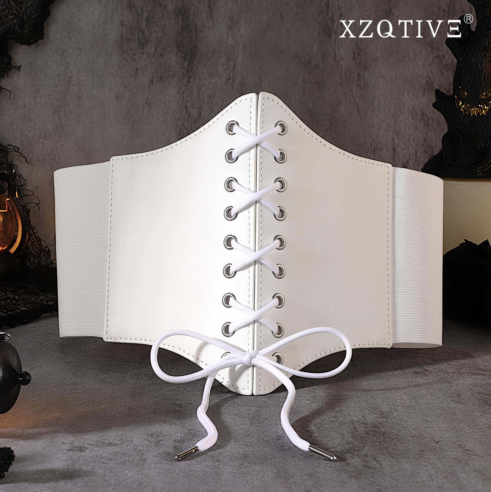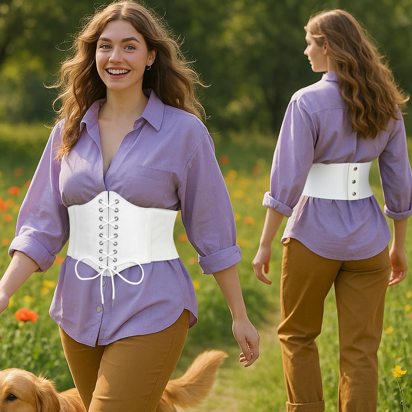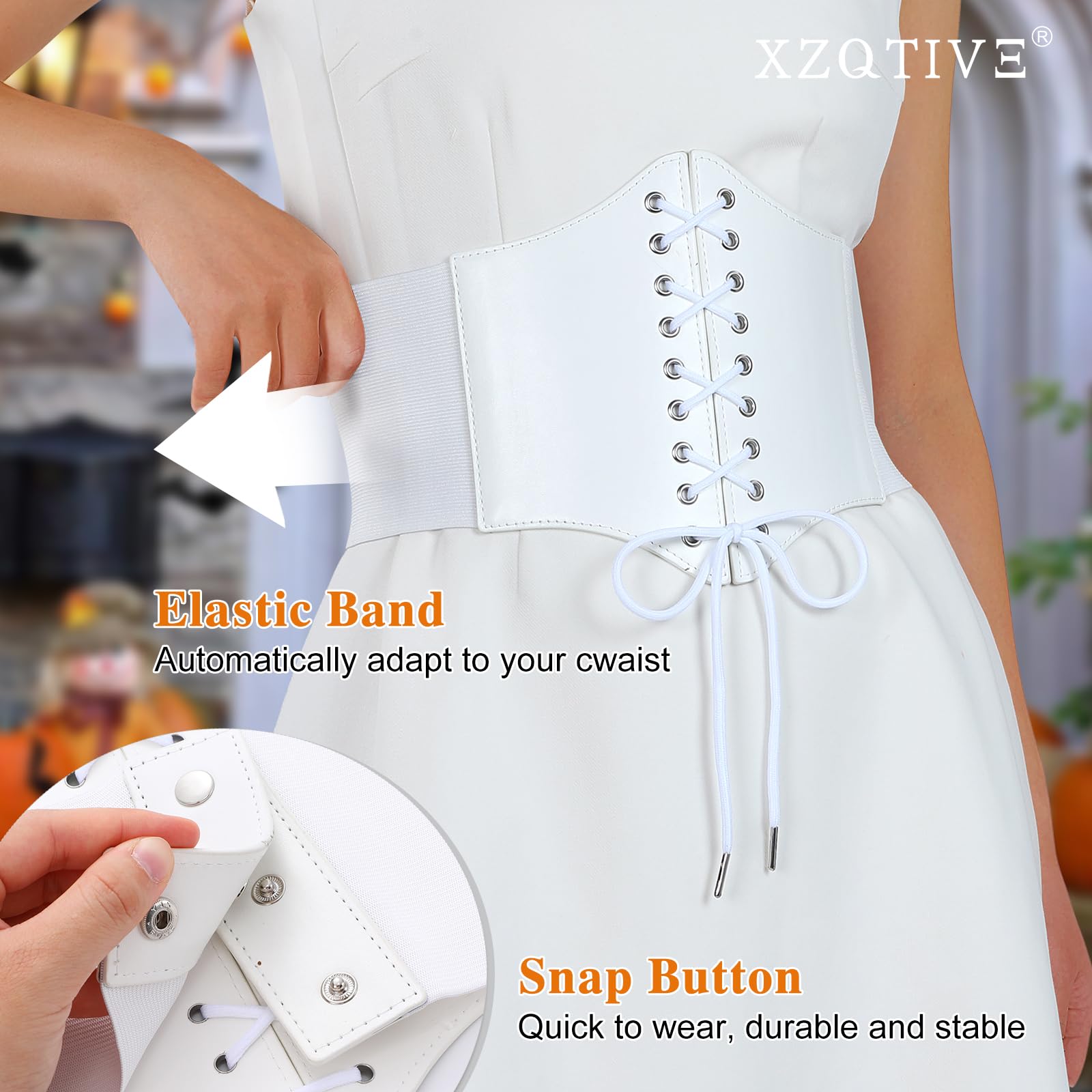 ➜ Black Corset Belt for Waist - Wide Costume cinching belt with tied corset leather on the front, elastic webbing band on the back, snap button closure to lock the belt,