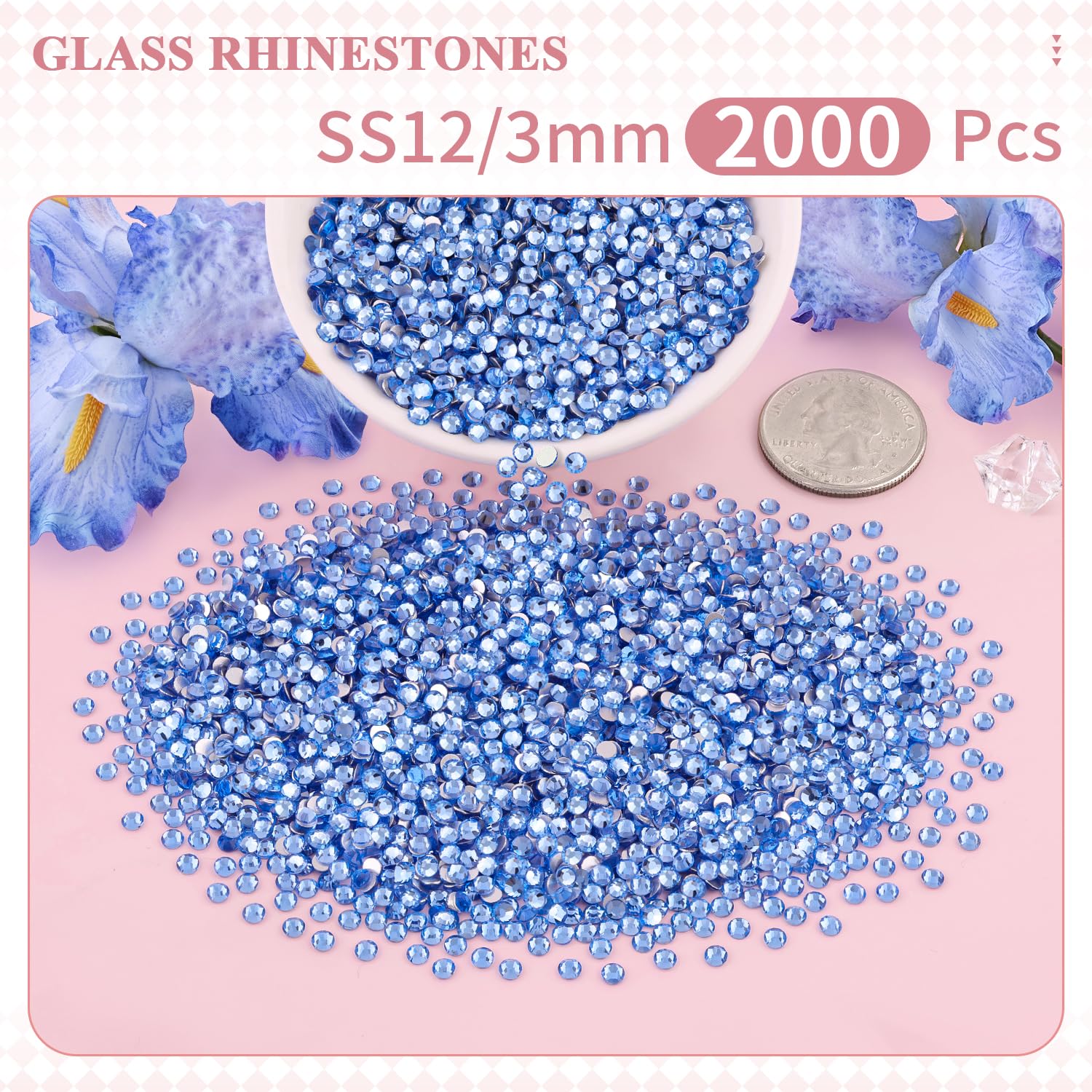WHAT WILL YOU GET -- The package contains about 2000 pcs SS12 (0.12") blingbling glass rhinestones (Light Sapphire). The large amount will support you to fulfill a number of wonderful DIY decoration ideas.