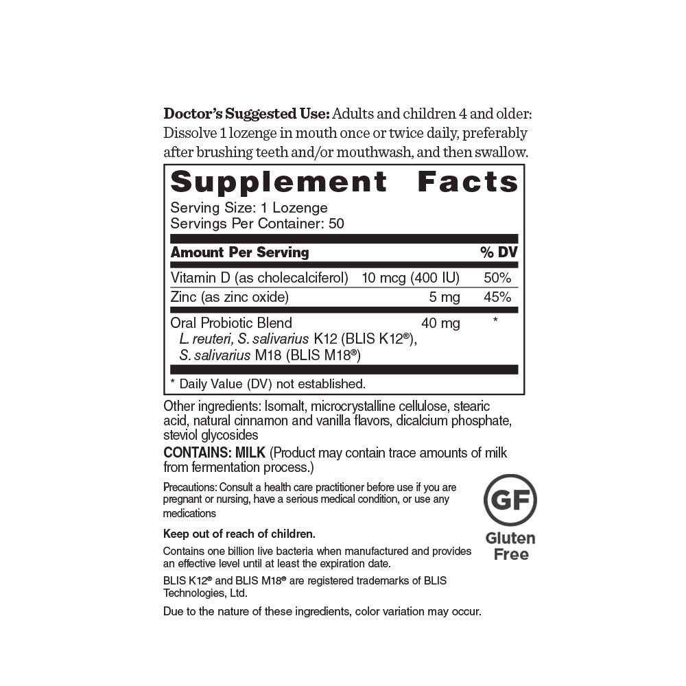 PROMOTES HEALTHY TEETH, GUMS, AND FRESH BREATH with three beneficialstrains of live probiotics including L. reuteri, S. salivarius BLIS K12, and S. salivarius BLIS M18 that help promote a healthy bacterial balance in the oral region.
