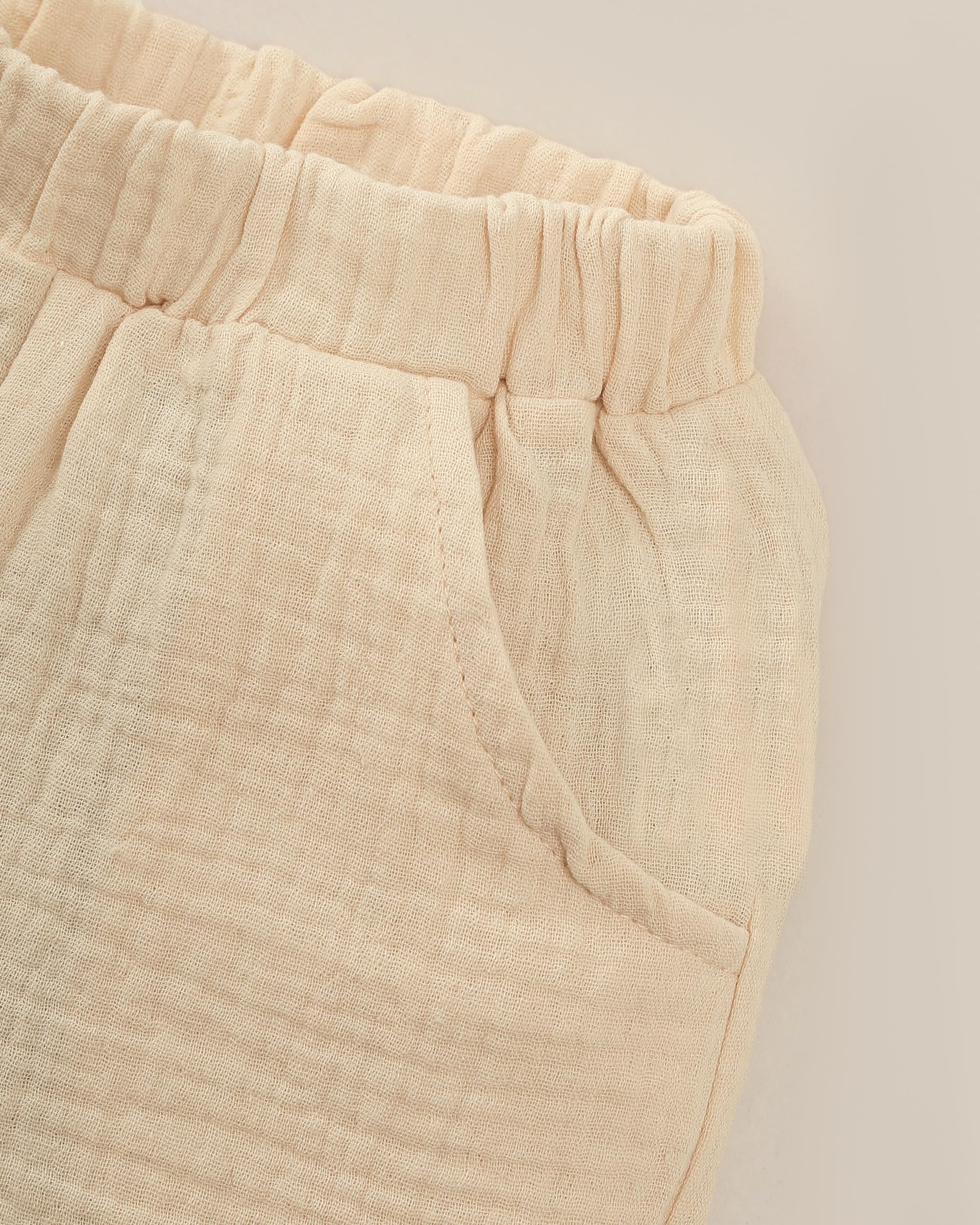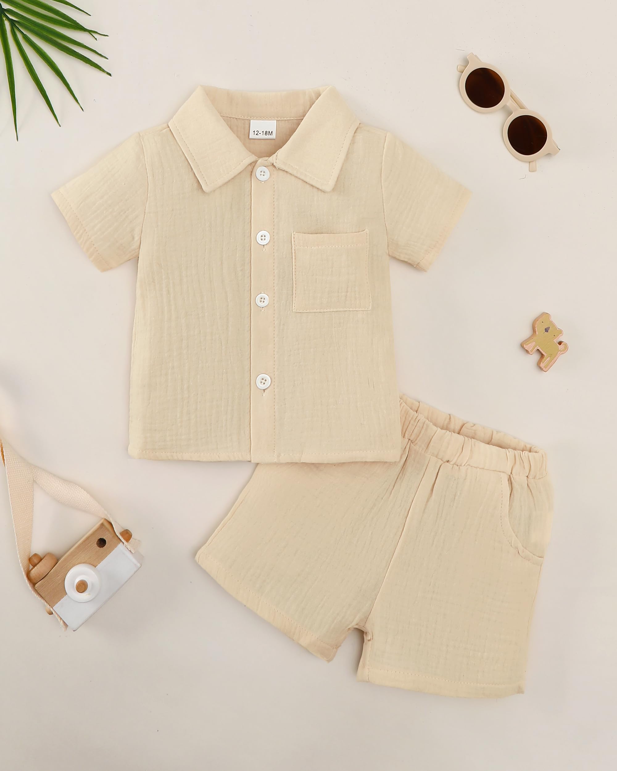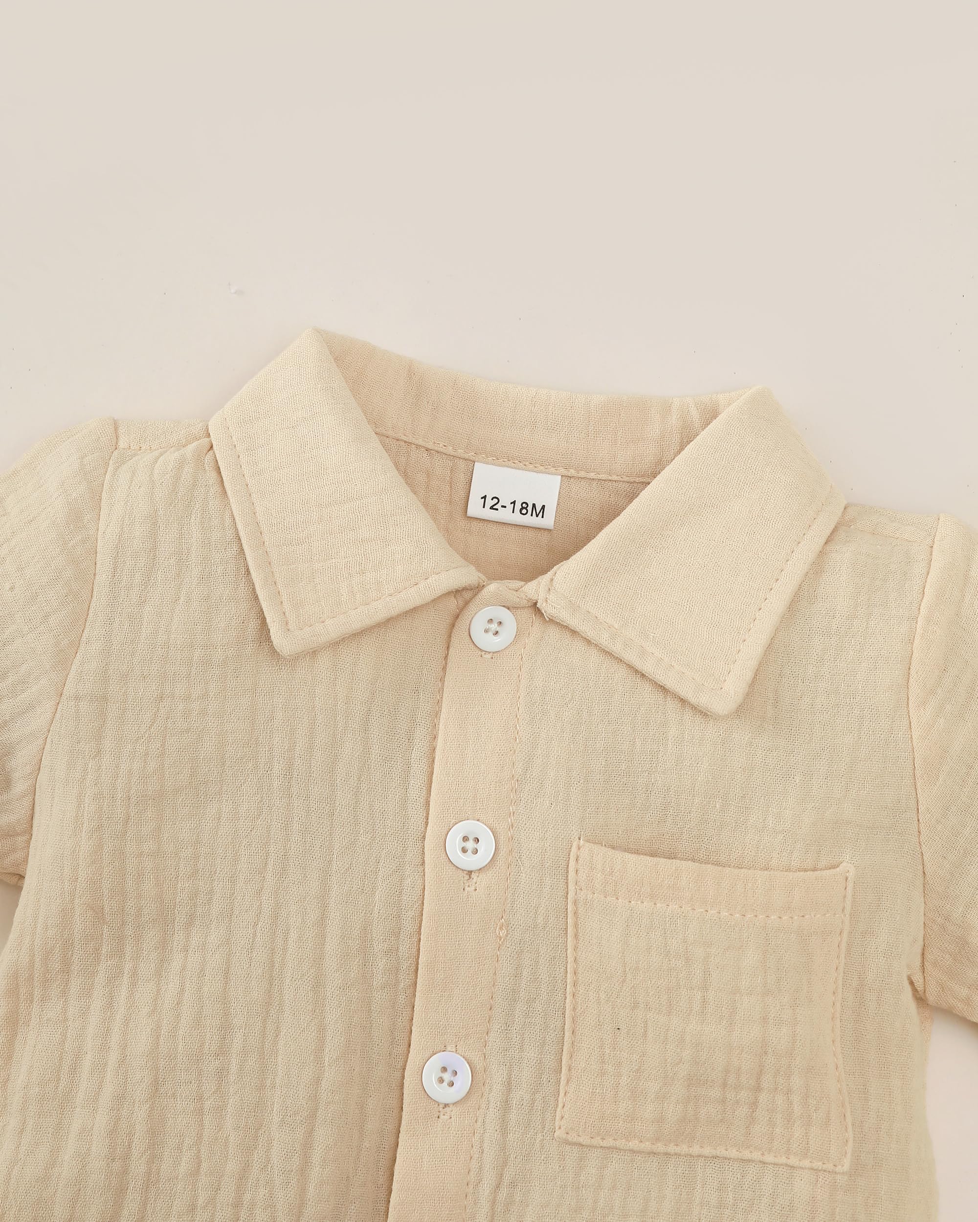 Minimalist Solid Design: Features a clean solid beige color with a white collar contrast and front pocket, offering a fresh, timeless summer style for little boys.
